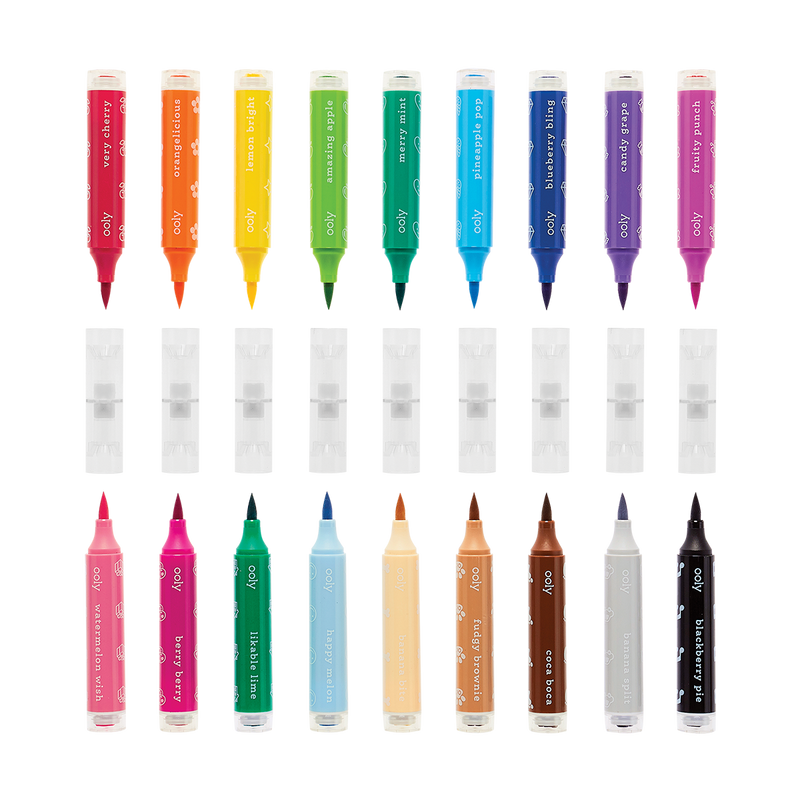 - każdy flamaster jest dwustronny: z jednej strony końcówka mazaka z drugiej stempelek