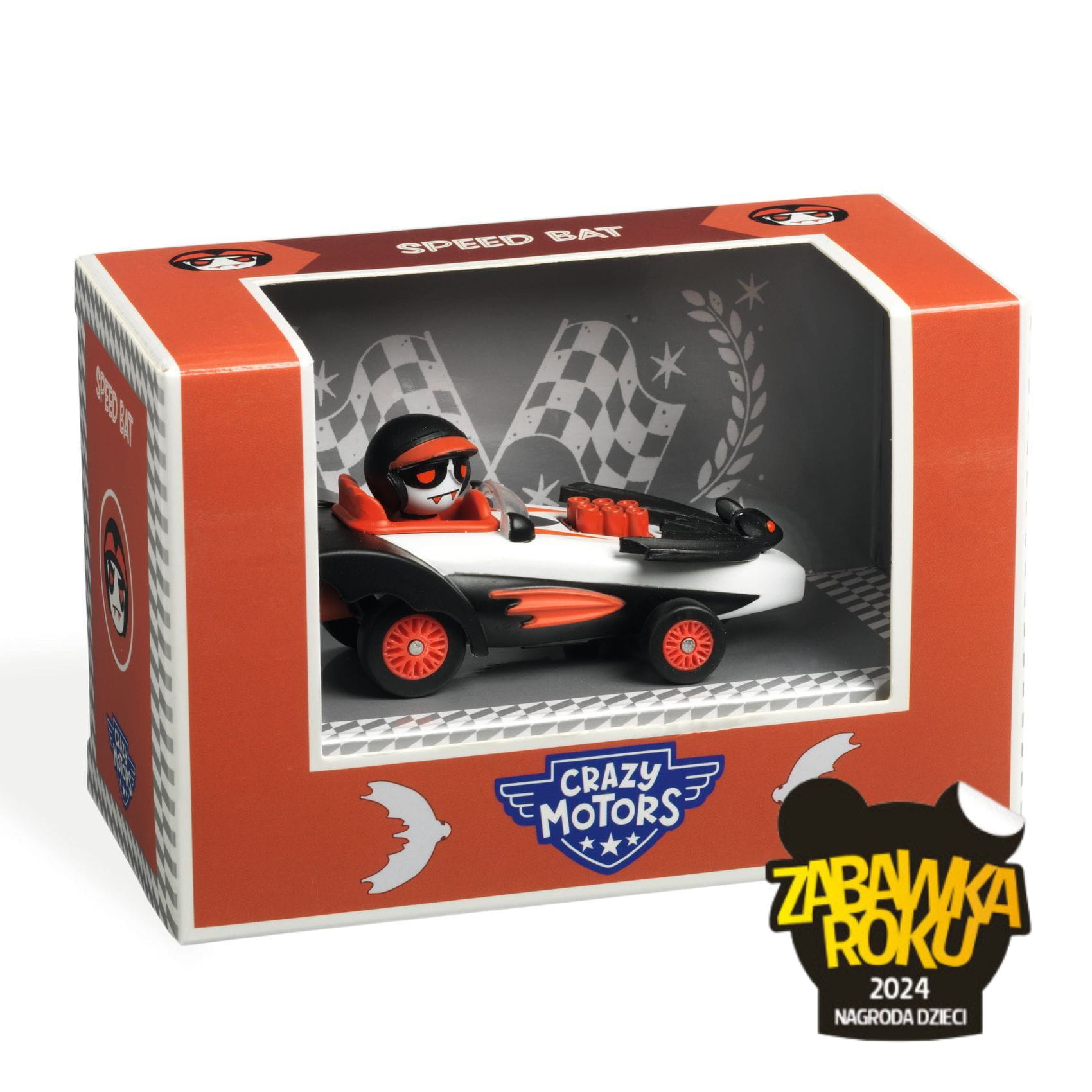 Nocne wyścigi to specjalność tego kierowcy o dość osobliwym wyglądzie. Jego blada cera i wampirze zęby sieją postrach. Speed Bat to samochodzik z nowej kolekcji Djeco- Crazy Motors. Jak sama nazwa wskazuje są to odjazdowe wyścigówki inspirowane kierowcami światowego formatu, takimi jak Niki Lauda, czy Michael Schumacher. Każde autko z serii jest wykonane z metalu i pojedynczych plastikowych części, które nadają unikatowego wyglądu. Posiadają metalowe zawieszenie i gumowe opony. Pojazdy pomalowane są metaliczną farbą. Każde autko prowadzi inny, przymocowany na stałe kierowca, którego głowa obraca się. Zabawka może stanowić część kolekcji, która liczy ponad 20 modeli oraz akcesoria takie jak laweta, puzzle droga i piętrowy warsztat samochodowy z windą, myjnią, parkingiem i stacją ładowania pojazdów.