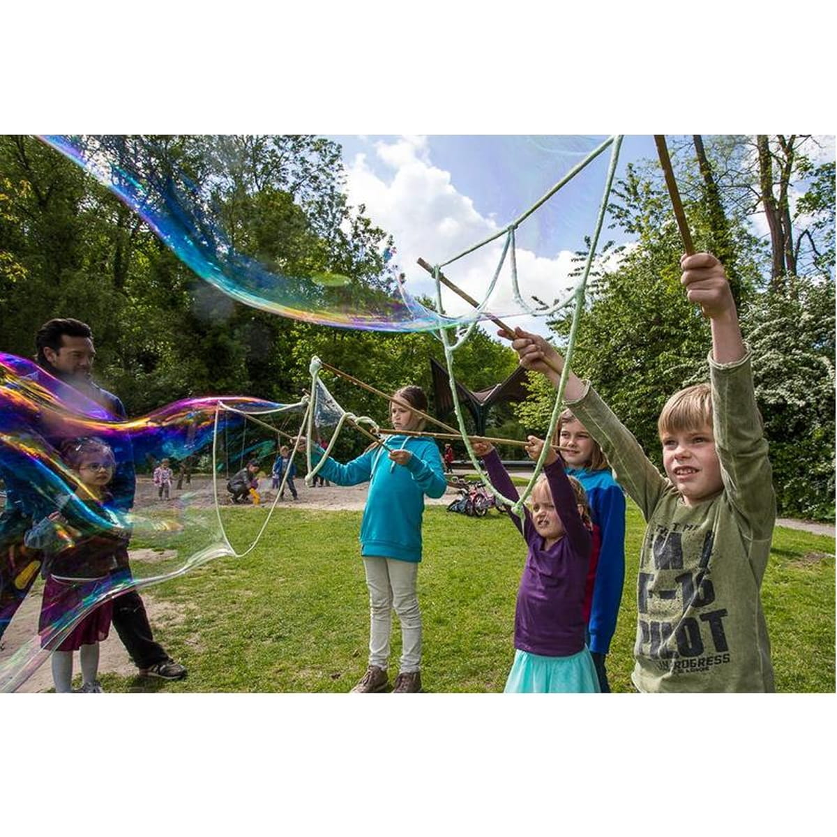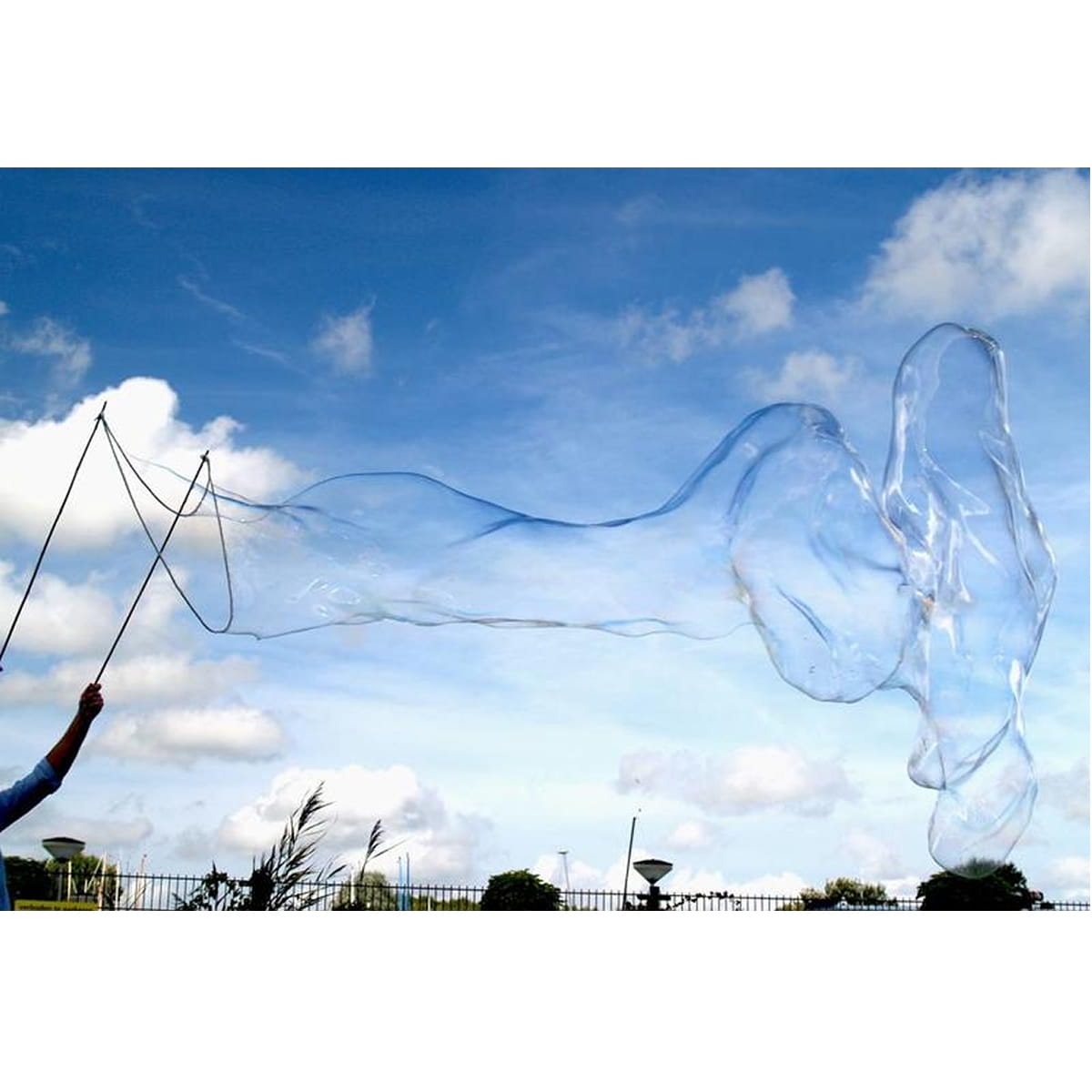 Zestaw do robienia gigantycznych baniek. Doskonale sprawdzi się jako atrakcja na przyjęciu urodzinowym lub podczas zabaw odbywających się na świeżym powietrzu.