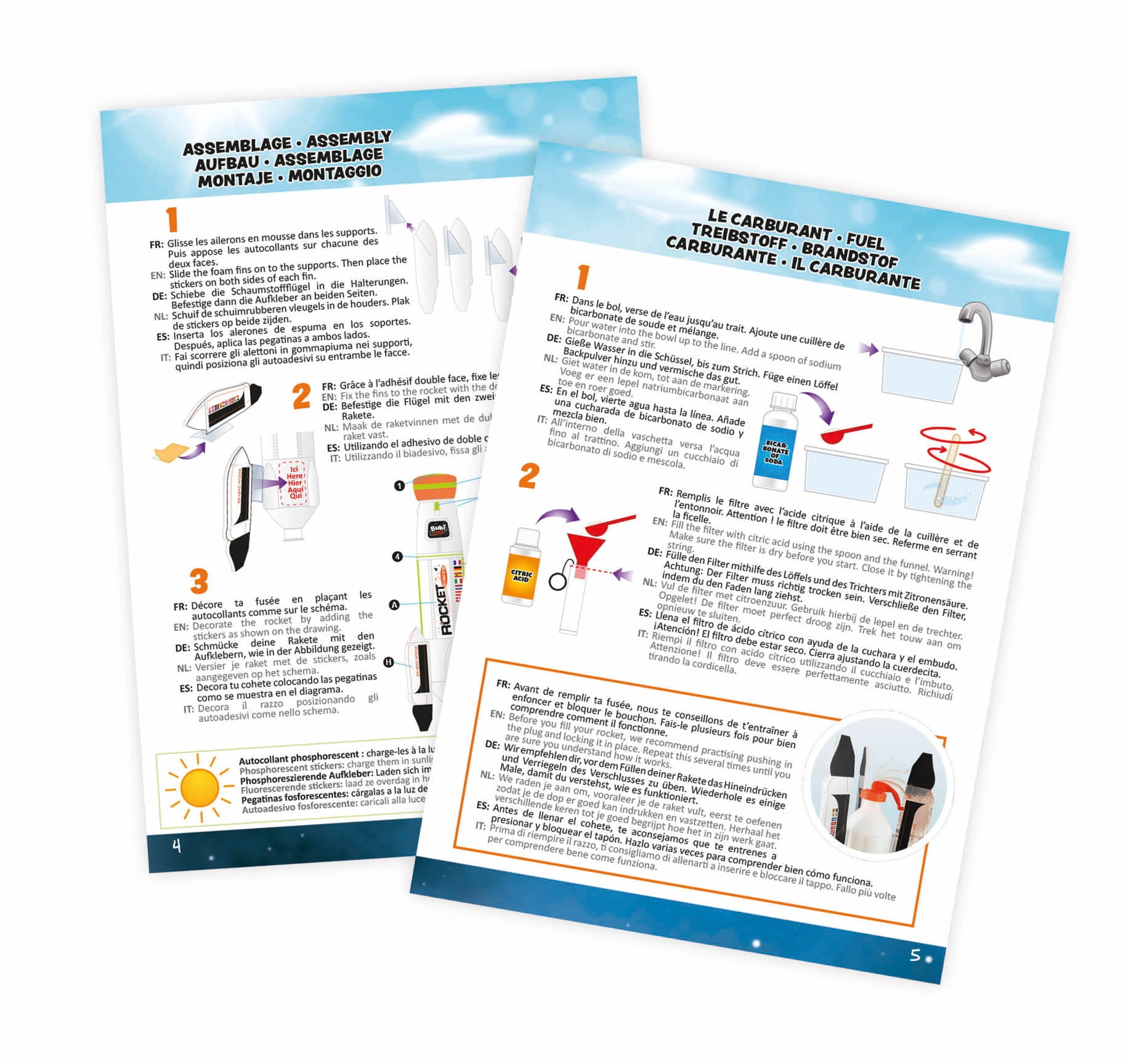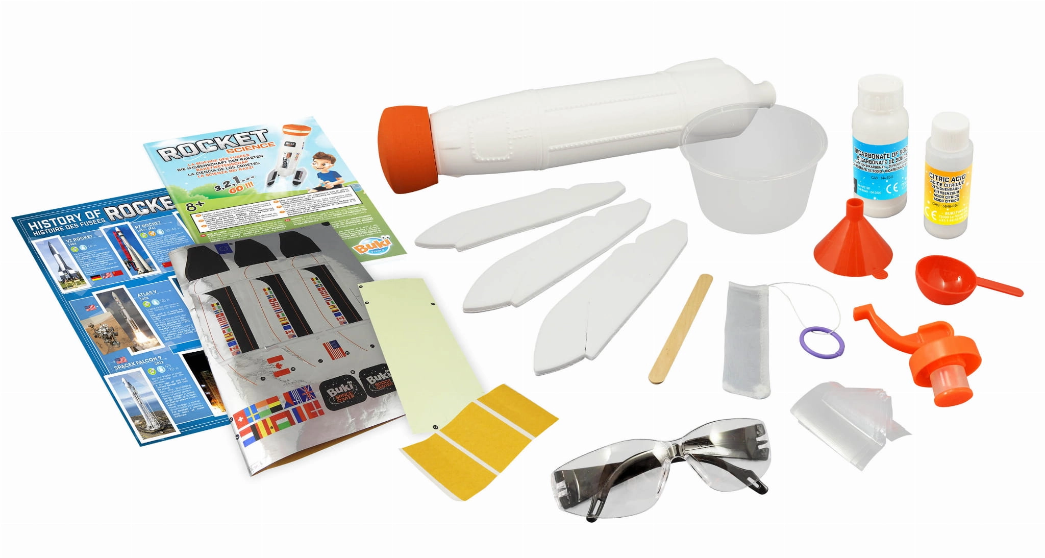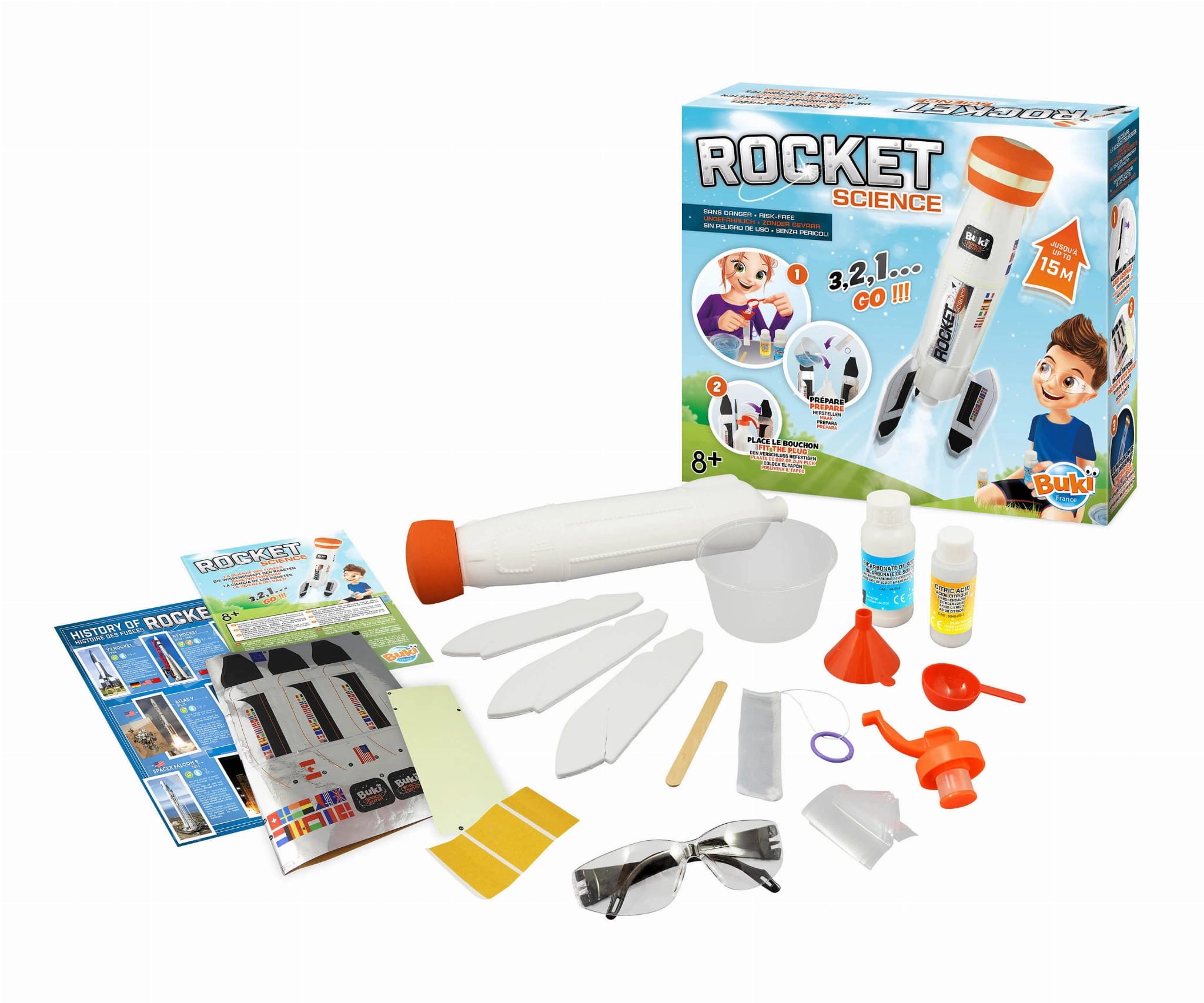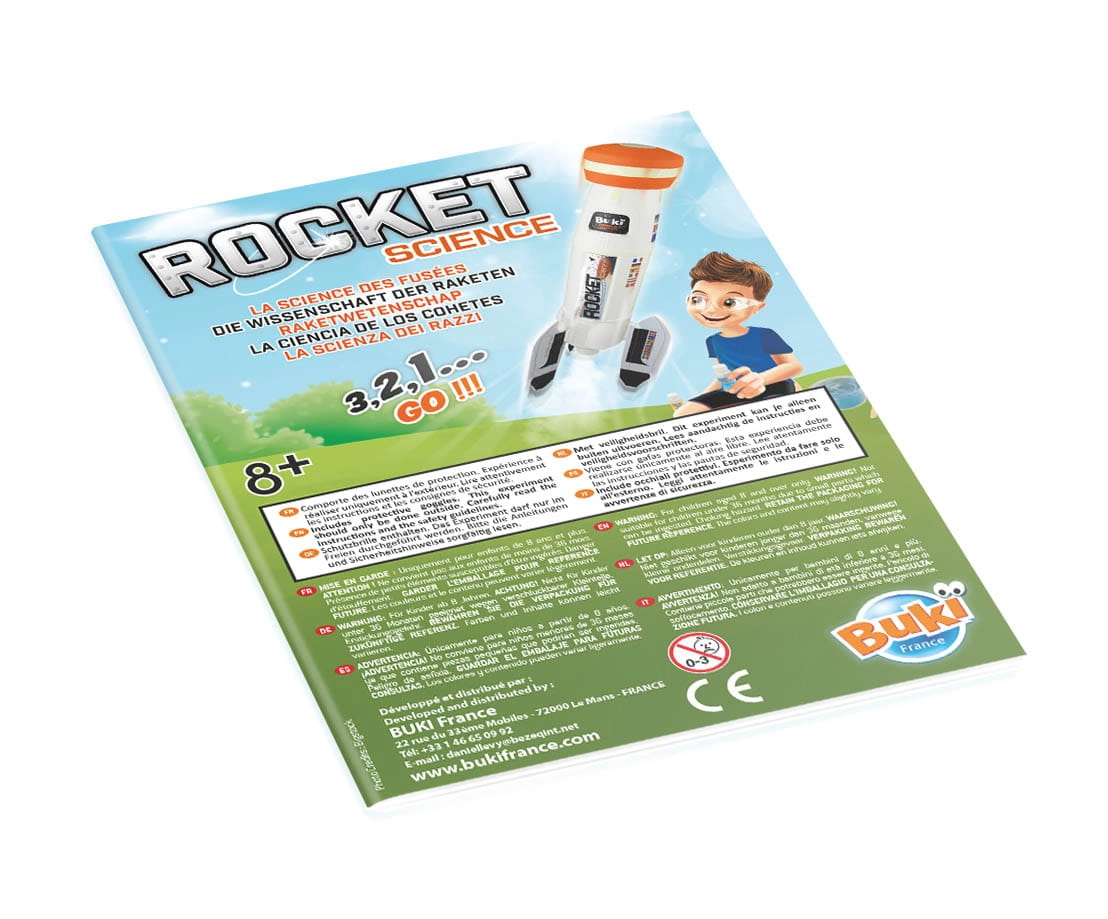 Zbuduj swoją rakietę i przygotuj ją do bezpiecznego startu. Przygotuj paliwo z dostarczonych składników, załóż korek bezpieczeństwa i wystrzel rakietę na wysokość nawet do 15 metrów!