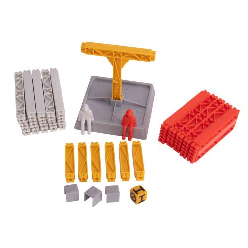 - Gra zawiera 30 belek w kolorze czerwonym i białym, 6 żółtych belek poprzecznych, 2 robotników (czerwony i biały), 3 szare blokady prac, podstawę, stojak T, jedną kostkę.