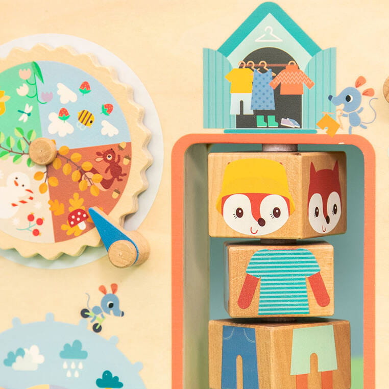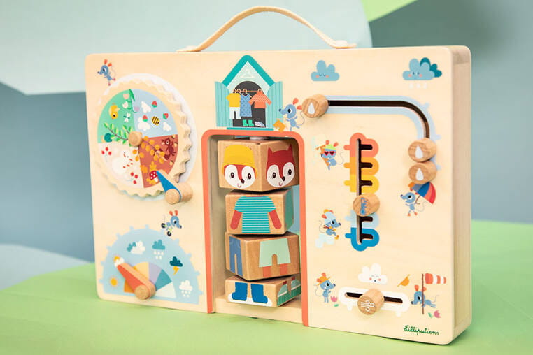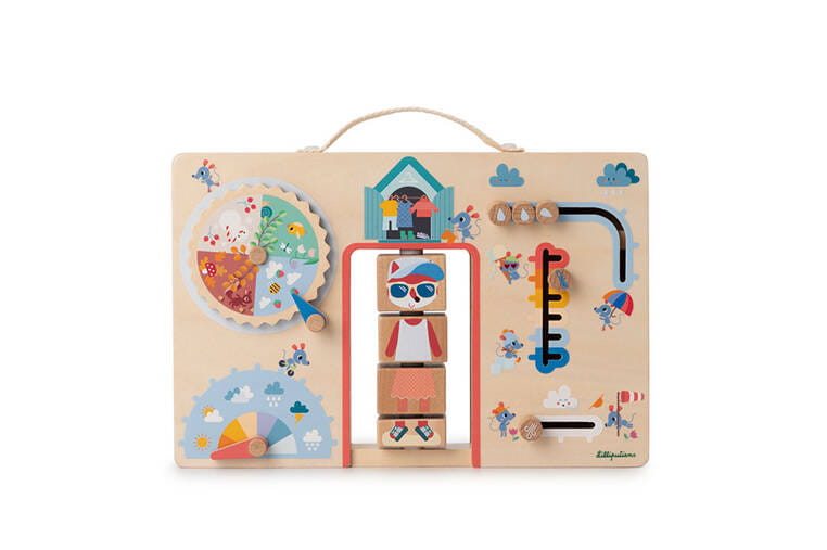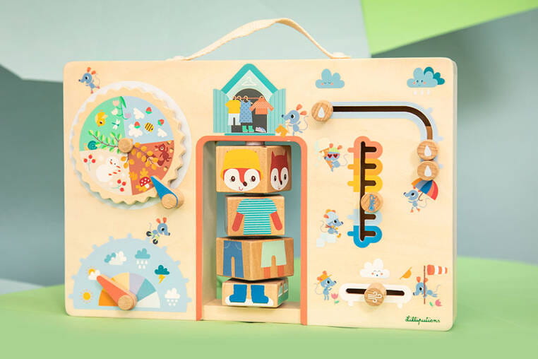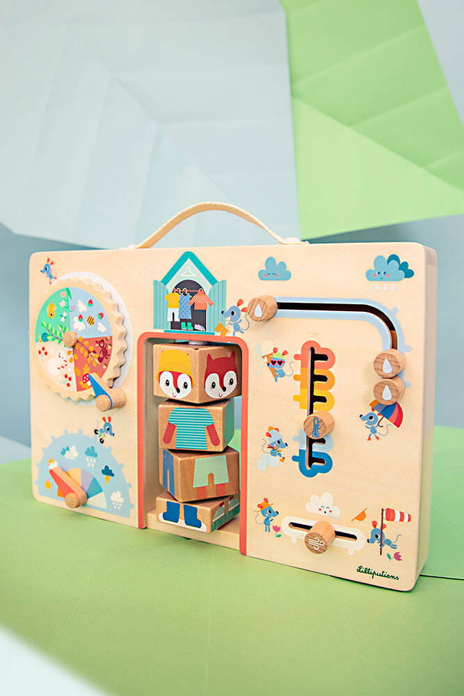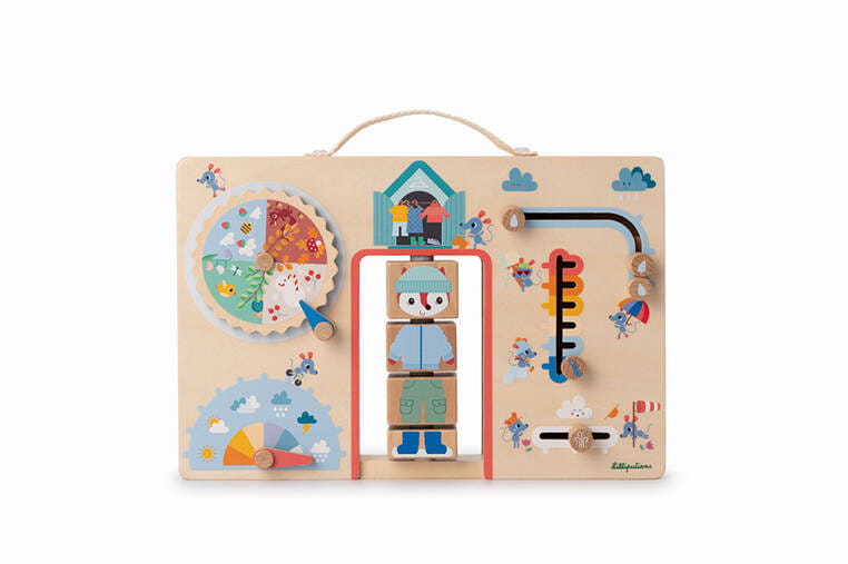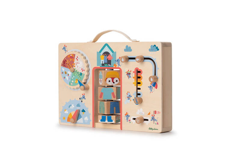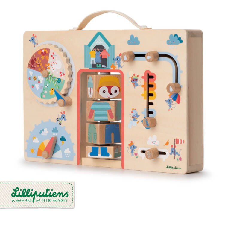 Drewniana tablica manipulacyjna w kształcie walizki z kolekcji Lisiczka Alice belgijskiej marki Lilliputiens to niebanalne wielofunkcyjne źródło rozrywki i nauki dla ciekawskich maluszków. Zabawka posiada aż sześć funkcji – wszystkie związane z określaniem warunków pogodowych: obrotowe koło zębate z 4 porami roku, ruchomą wskazówkę pozwalającą określić stopień zachmurzenia oraz 3 tory z klockami do przesuwania, dzięki którym można określić temperaturę, poziom intensywności wiatru i stopień opadów. Na środku tablicy znajduje się układanka składająca się z 4 obracanych klocków, dzięki której można ubrać Lisiczkę Alice odpowiednio do określonej przez siebie pogody.