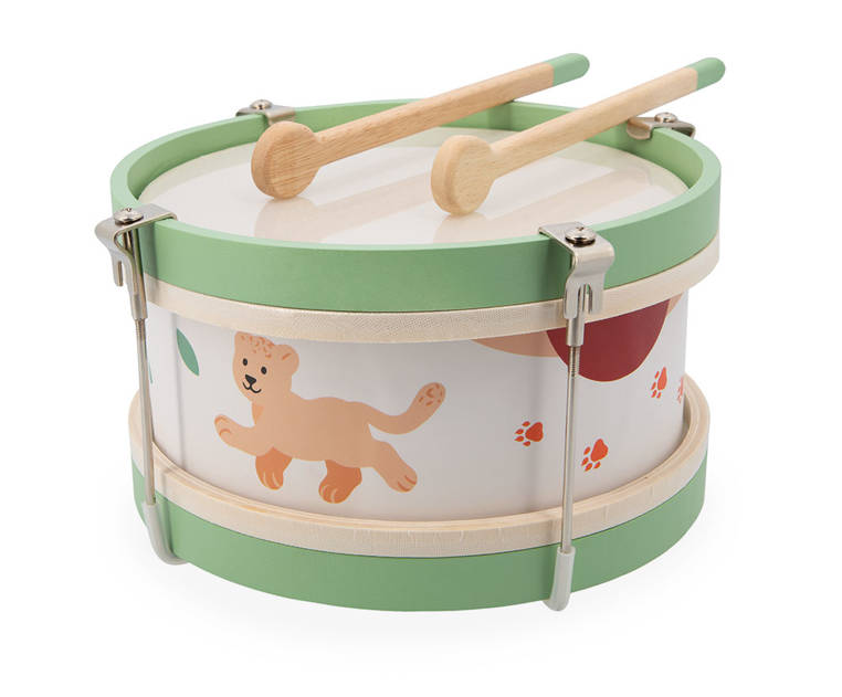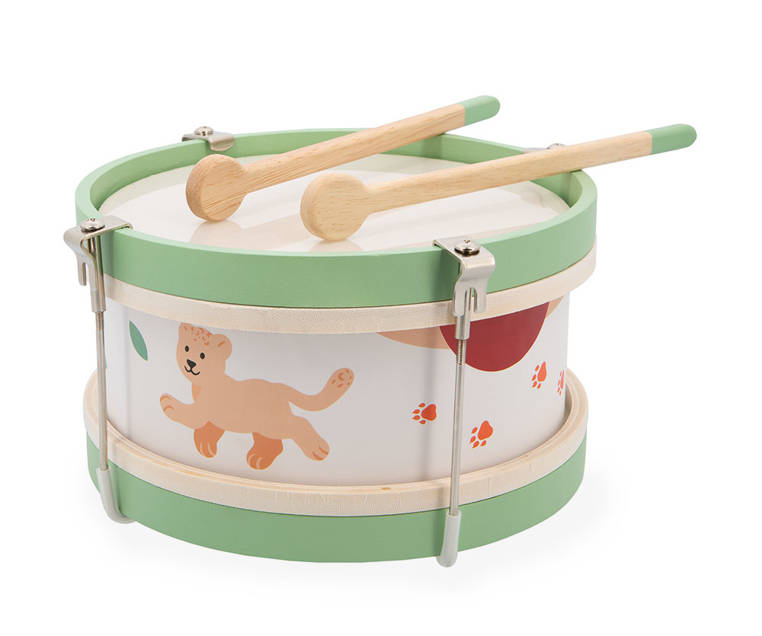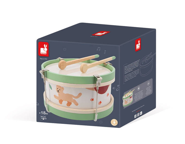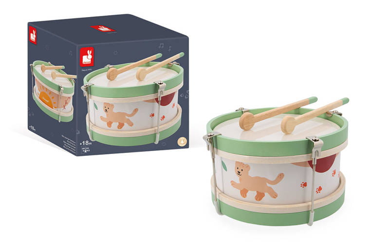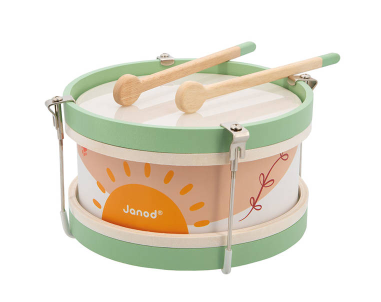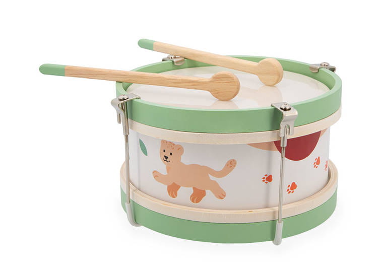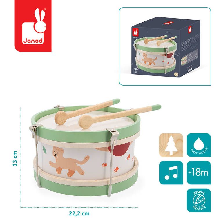 Drewniany bębenek z serii Sunshine francuskiej marki JANOD to idealna pierwsza zabawka muzyczna dla dziecka, która pomaga rozwijać słuch, poczucie rytmu oraz zdolności muzyczne. Wspiera także rozwój wyobraźni, koncentracji, wytrwałości i koordynacji ruchowej. Bębenek ma drewnianą konstrukcję, wzmocnioną metalowymi uchwytami, poręczny rozmiar, dwa patyczki do wystukiwania rytmu i piękną słoneczną kolorystykę – na brzegach namalowane jest małe lwiątko Leo oraz pomarańczowe odciski łap.