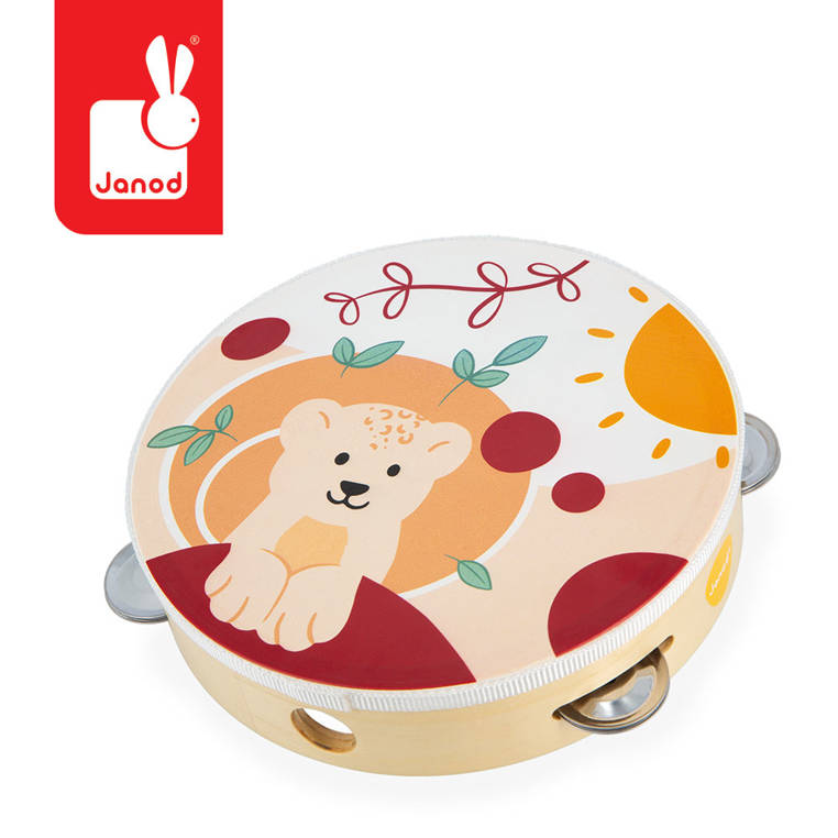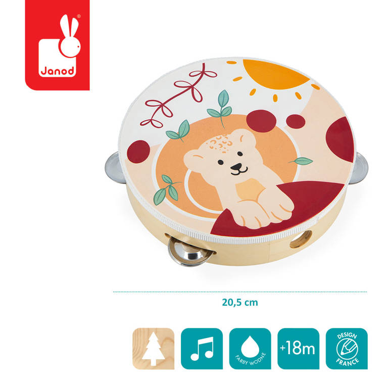 Drewniany tamburyn z serii Sunshine francuskiej marki JANOD to idealna pierwsza zabawka muzyczna dla dziecka, która pomaga rozwijać słuch, poczucie rytmu oraz zdolności muzyczne. Wspiera także rozwój wyobraźni, koncentracji, wytrwałości i koordynacji ruchowej. Instrument ma drewnianą konstrukcję i cztery pary metalowych talerzyków, poręczny rozmiar i piękną słoneczną kolorystykę – na membranie namalowany jest mały lewek Leo oraz grafiki w ciepłych barwach.