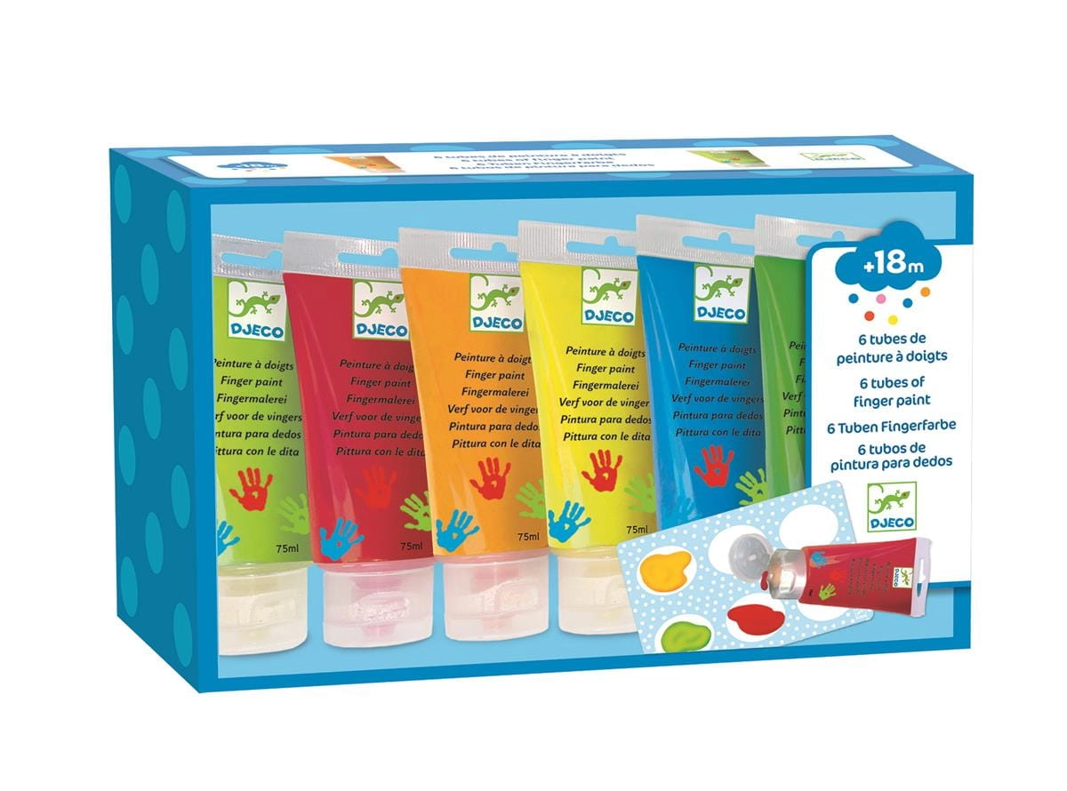 Zestaw składa się z 6 × 75 ml tubek zmywalnej farby i plastikowej podkładki do mieszania kolorów.