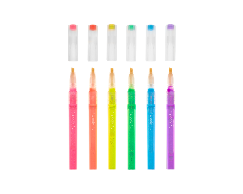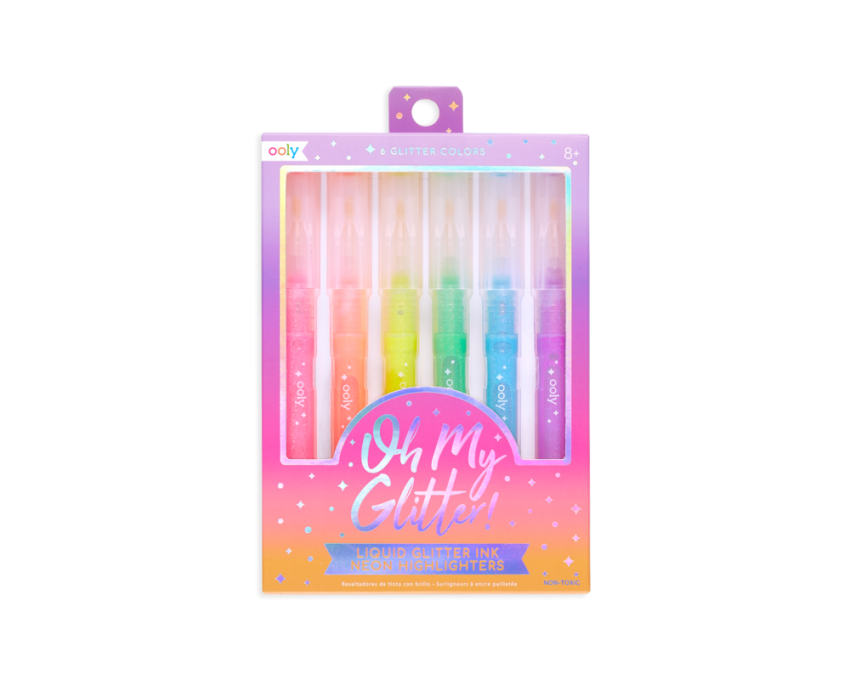 Brokat, dużo brokatu i jeszcze więcej brokatu! To jest to, co dostaniesz razem z flamastrami Oh My Glitter! Zestaw składa się z 6 intensywnie neonowych zakreślaczy z płynnym, błyszczącym tuszem. Specjalne końcówki o ściętym kształcie dają różnorodne możliwości kreacji i dużą wszechstronność w zastosowaniu, a ich brokatowy blask z pewnością będzie przyciągać uwagę!