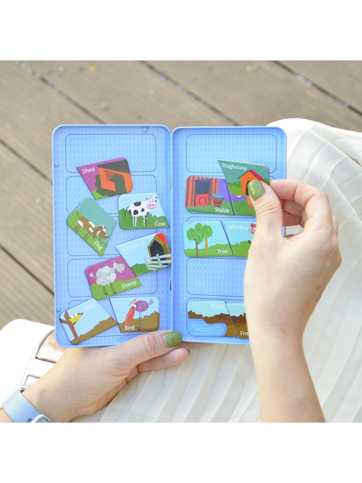 Zwierzęta i ich domy to puzzle dla najmłodszych w wersji magnetycznej. Zadaniem dziecka jest odpowiednie dopasowanie zwierzątka do jego domu. Kolorowe ilustracje zachęcają do zabawy. Dodatkowo każdy obrazek podpisany jest w języku angielskim dzięki czemu zabawka jest pomocna przy nauce pierwszych angielskich słów. Gra wspiera rozwój takich umiejętności jak obserwacja, koncentracja oraz motoryka. Dzięki temu, że magnetyczne puzzle trzymają się metalowego opakowania świetnie sprawdzą się w podróży. Magnetyczne elementy nie pogubią się, w każdej chwili można wrócić do układanki. Całość zapakowana jest w poręczne, metalowe pudełko.
