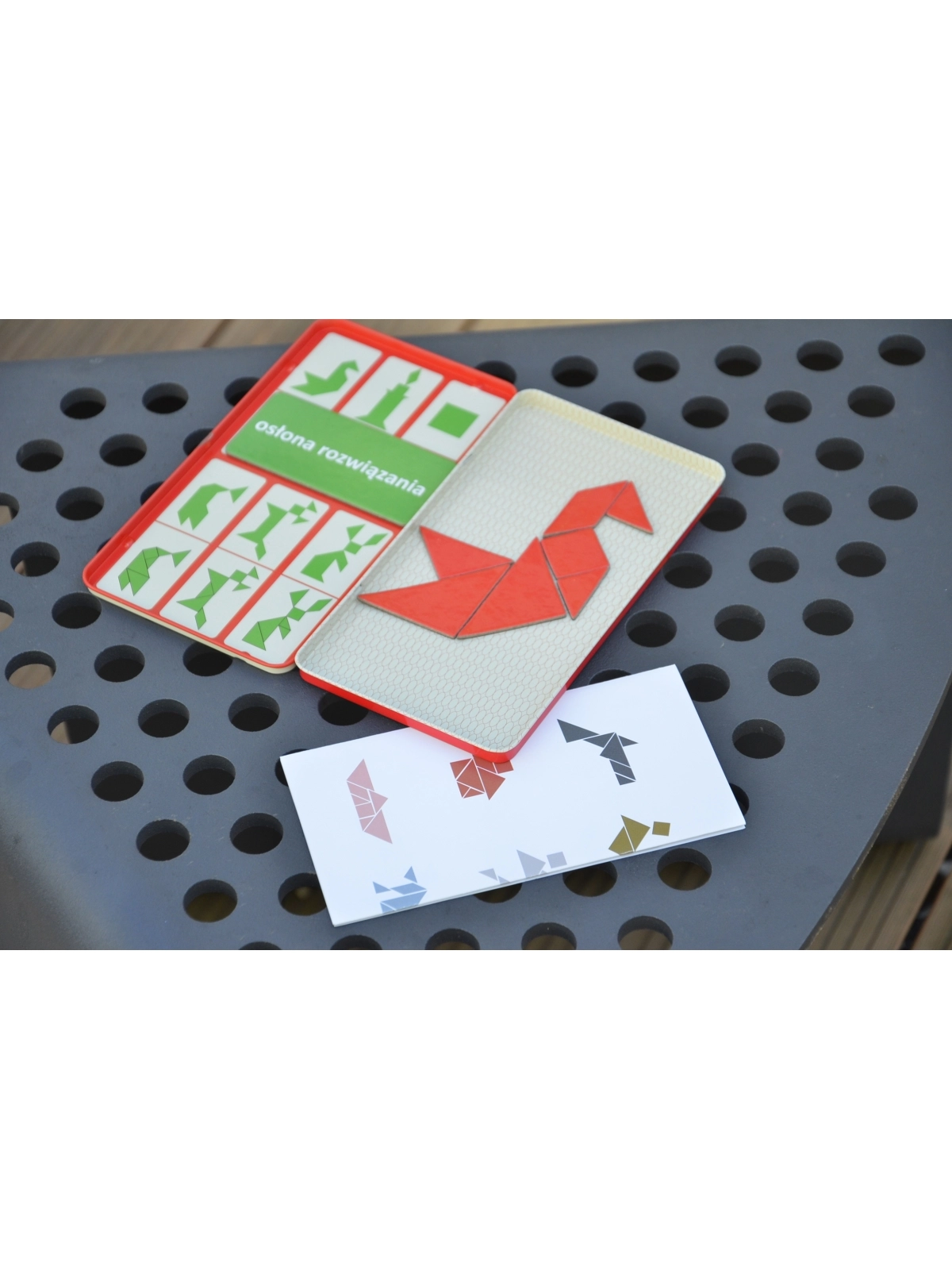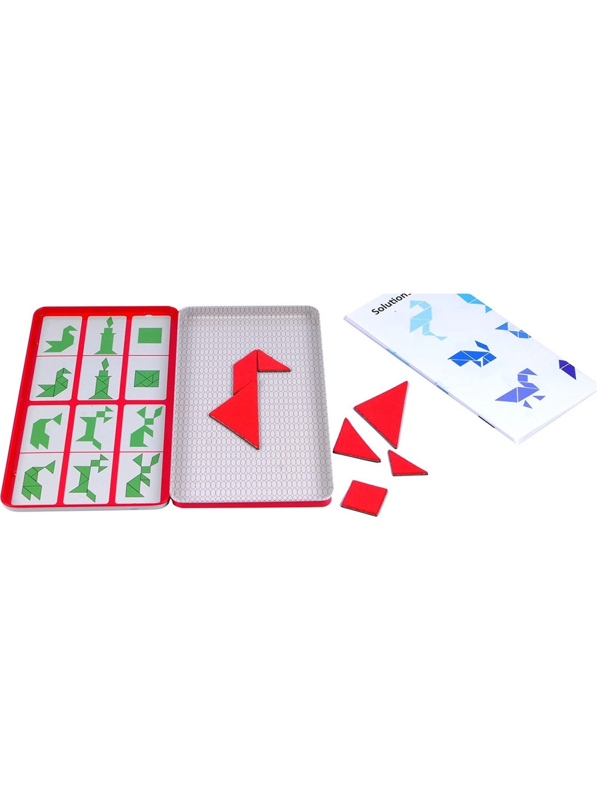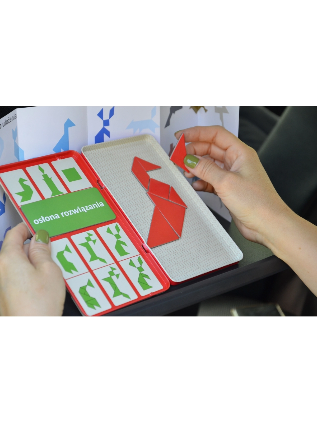 Zasady gry: Zakryj rozwiązania za pomocą magnetycznej tabliczki „osłona rozwiązania” i spróbuj odwzorować obrazek na podstawie kształtów jego konturu. Należy wykorzystać wszystkie siedem elementów. Nie mogą na siebie nachodzić. Za pomocą tangramu można ułożyć tysiące obrazków sylwetek ludzi i zwierząt, przedmiotów, figur geometrycznych. Jeśli uda Ci się ułożyć wszystkie figury załączone do zestawu to więcej z łatwością wyszukasz w Google.