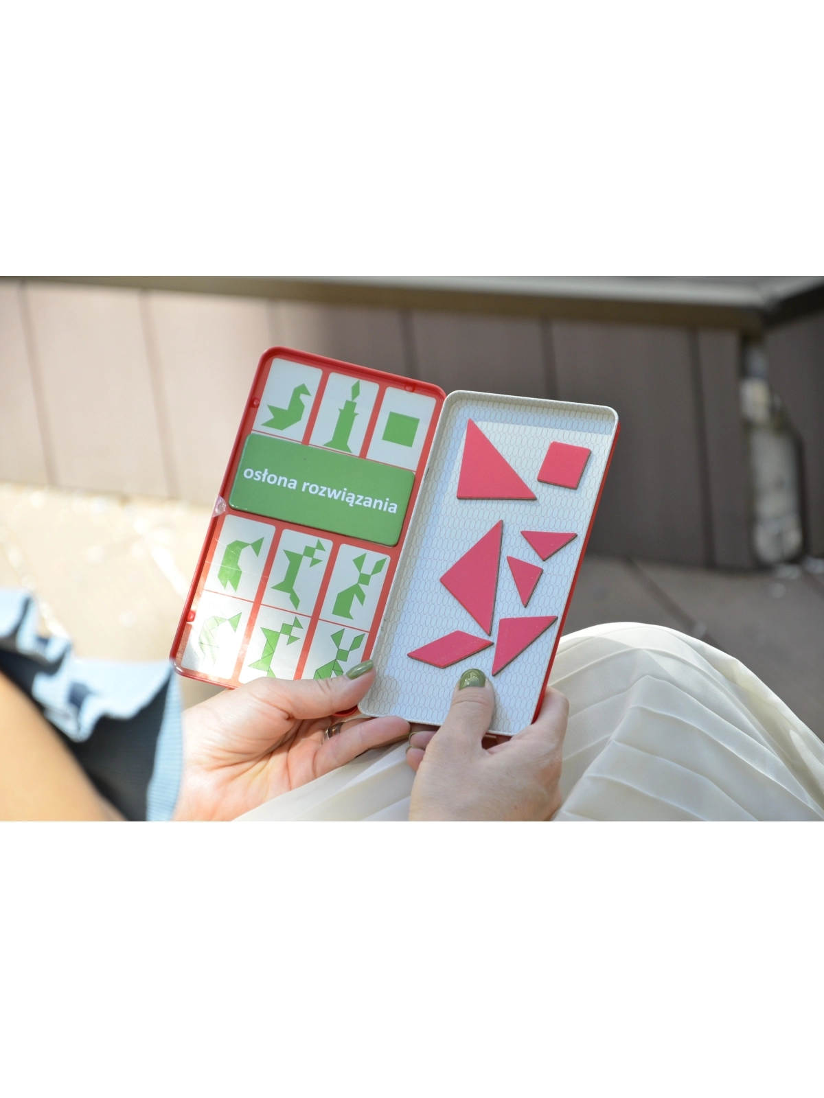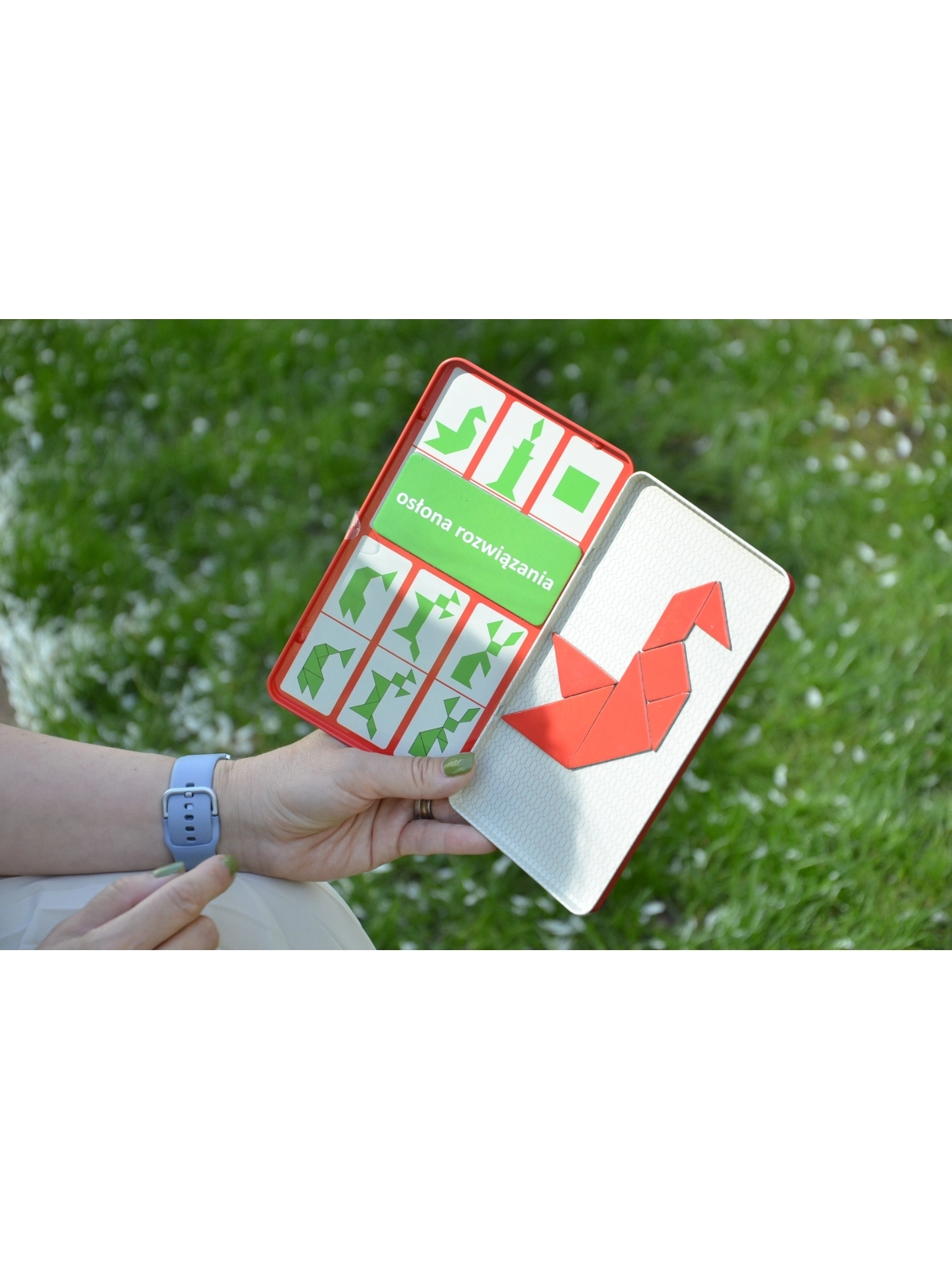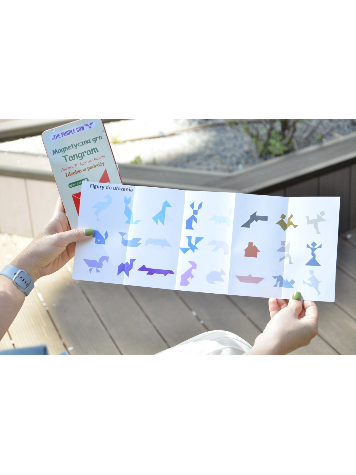 Zasady gry: Zakryj rozwiązania za pomocą magnetycznej tabliczki „osłona rozwiązania” i spróbuj odwzorować obrazek na podstawie kształtów jego konturu. Należy wykorzystać wszystkie siedem elementów. Nie mogą na siebie nachodzić. Za pomocą tangramu można ułożyć tysiące obrazków sylwetek ludzi i zwierząt, przedmiotów, figur geometrycznych. Jeśli uda Ci się ułożyć wszystkie figury załączone do zestawu to więcej z łatwością wyszukasz w Google.