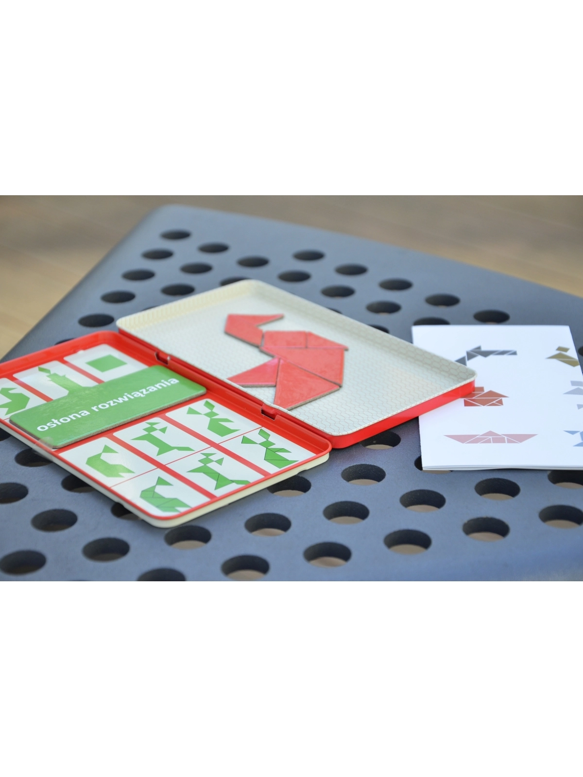 - w zestawie znajduje się 7 magnesów, magnetyczna tabliczka, plansza oraz łącznik planszy, 30 ilustracji z figurami do ułożenia (wraz z rozwiązaniami);