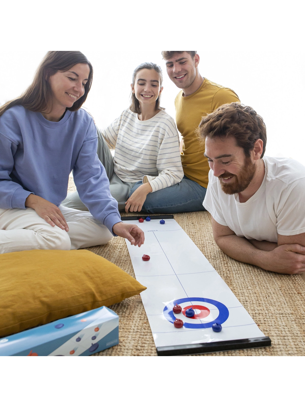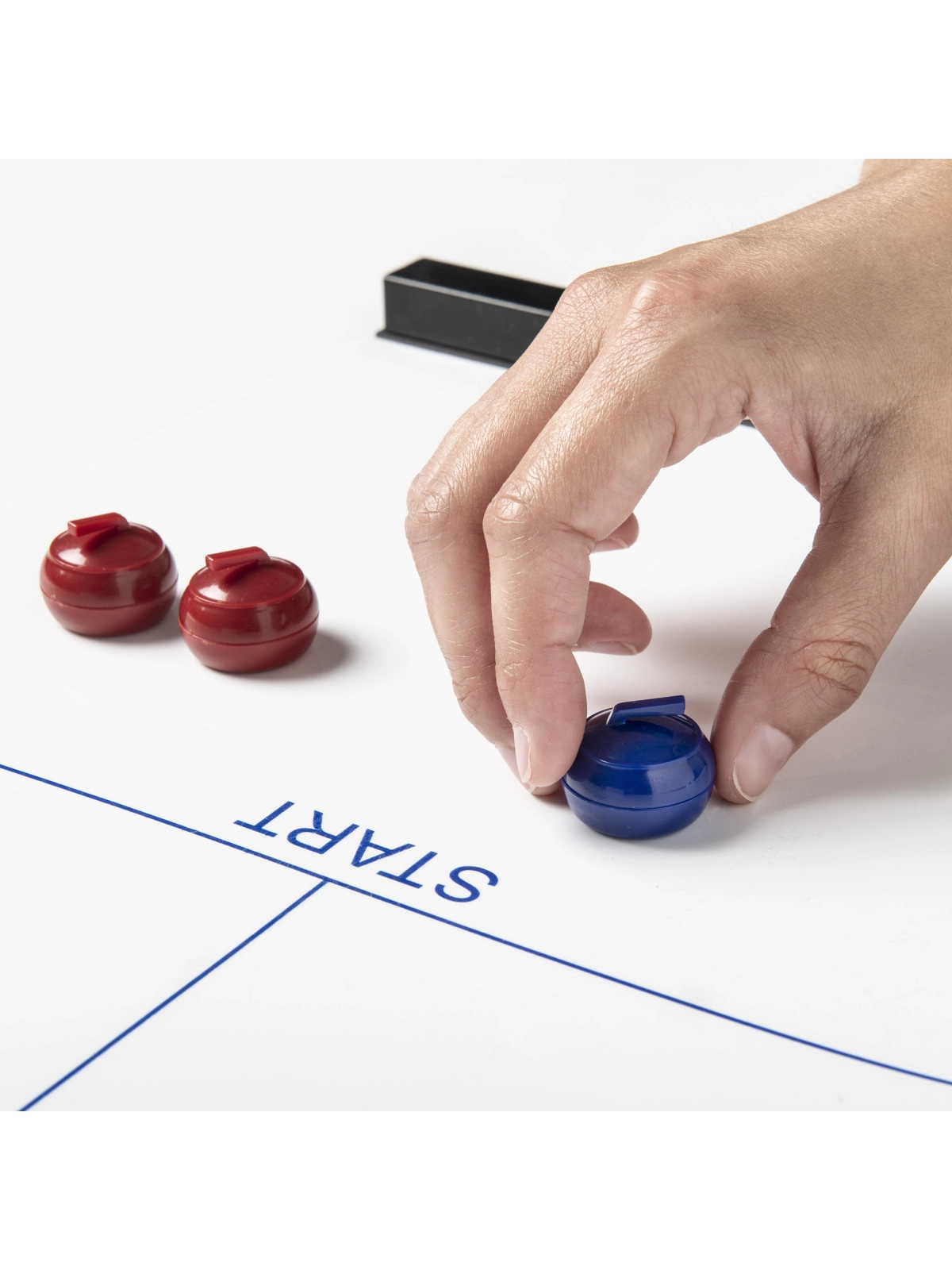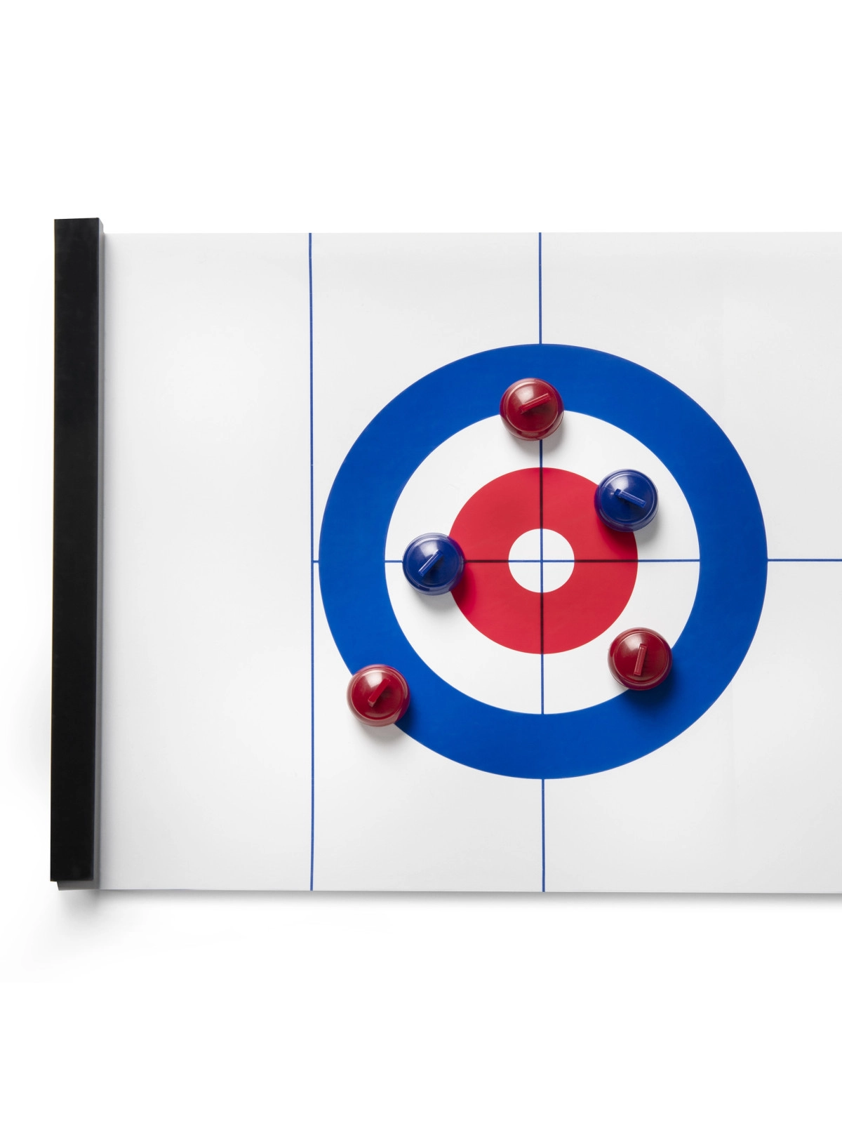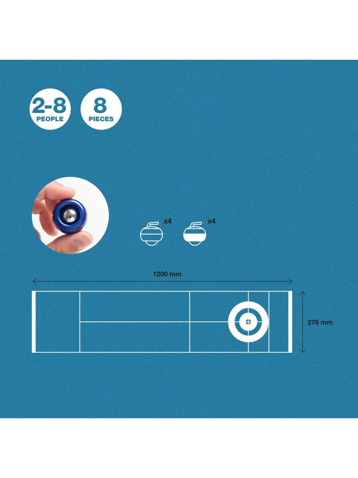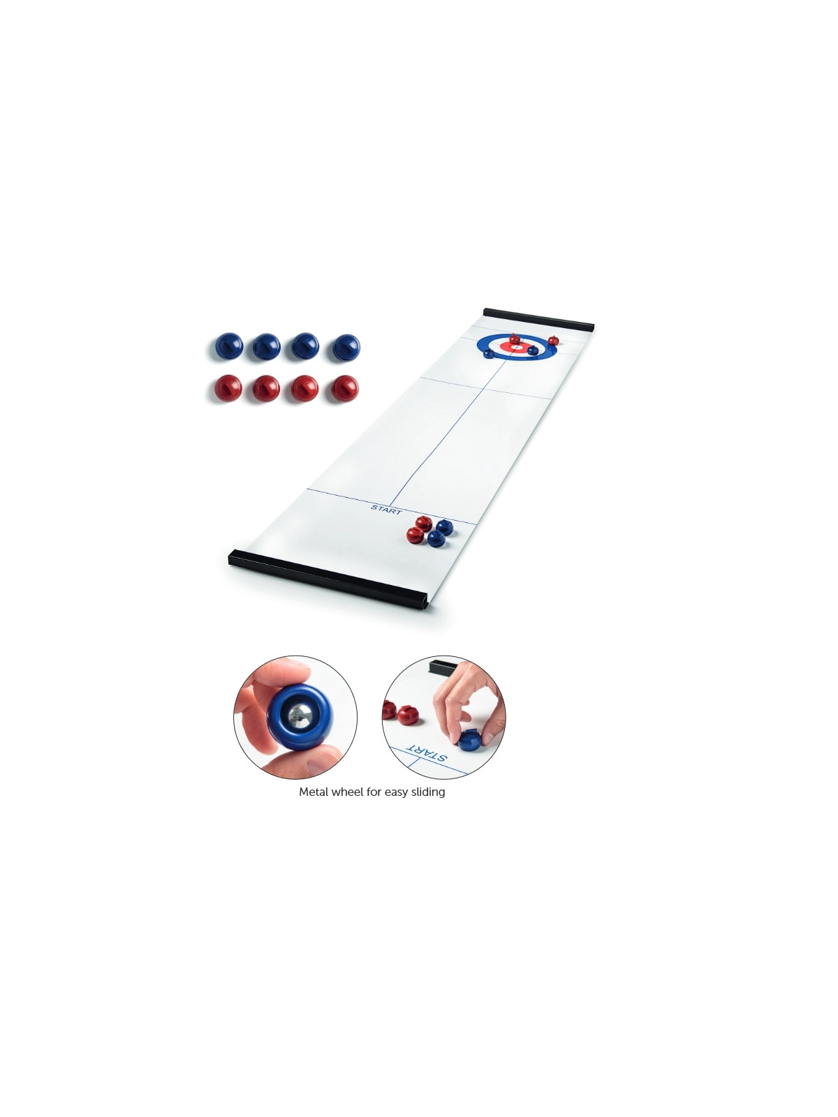 Planszowa gra Curling składająca się z połyskliwej planszy o długości 120 cm, czterech niebieskich i czterech czerwonych pionków z metalowym kółkiem pod spodem, dzięki któremu poruszają się lekko po planszy. Korzystając z wszystkich pionków, możemy stworzyć dwie drużyny. Gra jest niewielkich rozmiarów, dzięki czemu można zabrać ją ze sobą wszędzie, będzie rozrywką dla całej rodziny, przyczyni się do rozwoju koordynacji i zręczności. Wygrywa ten, komu uda się umieścić swoje pionki jak najbliżej celu.