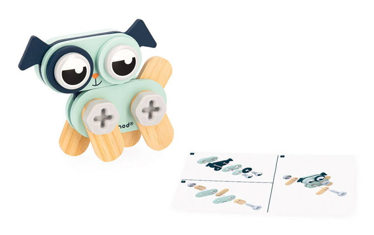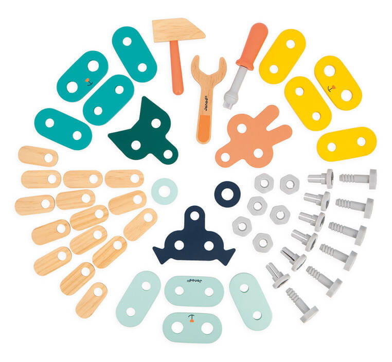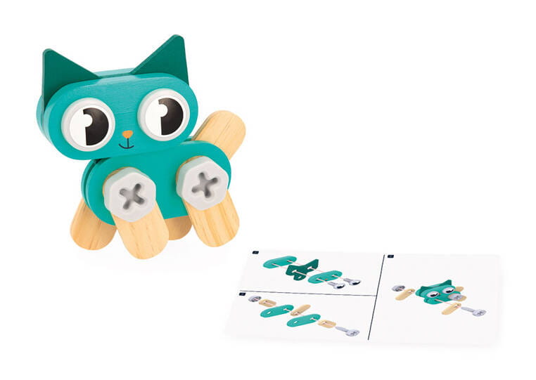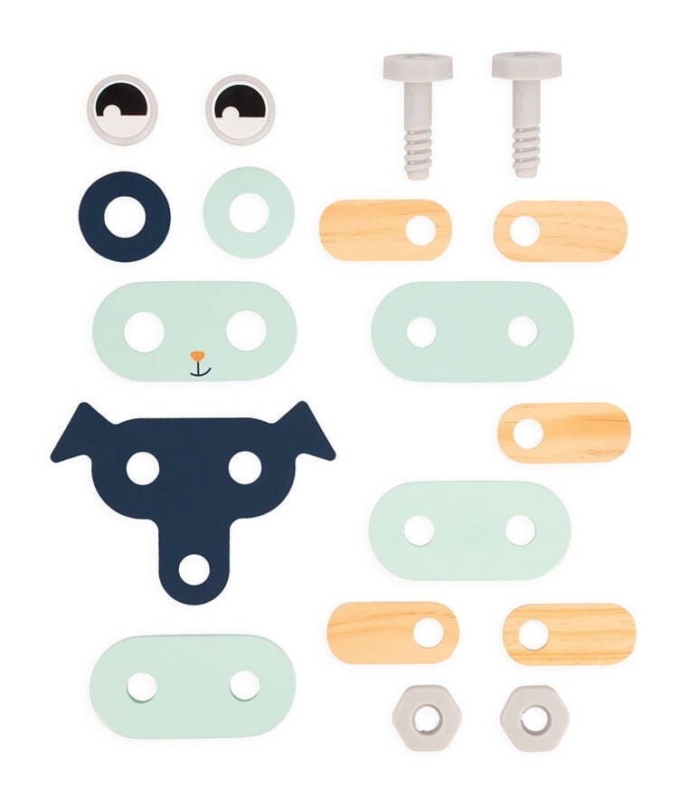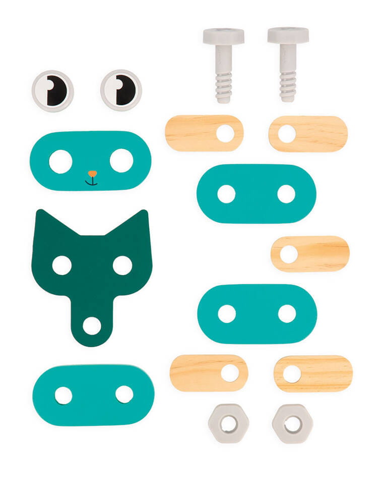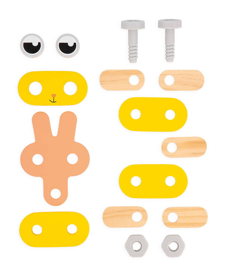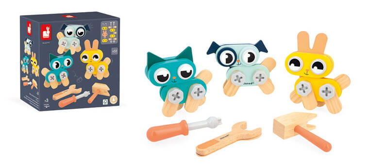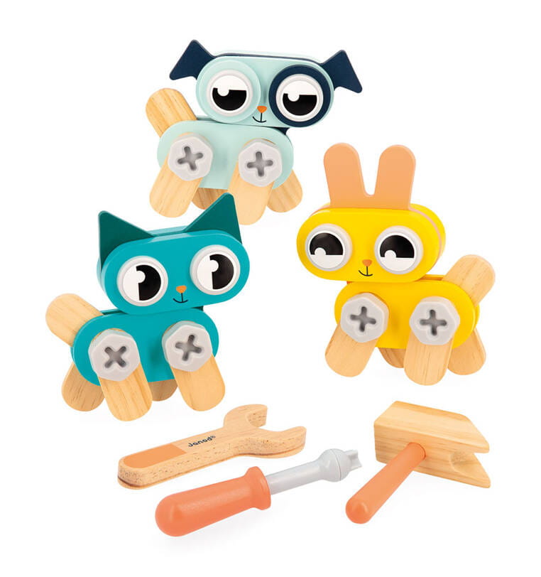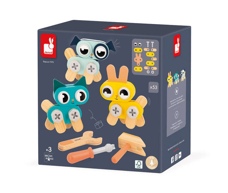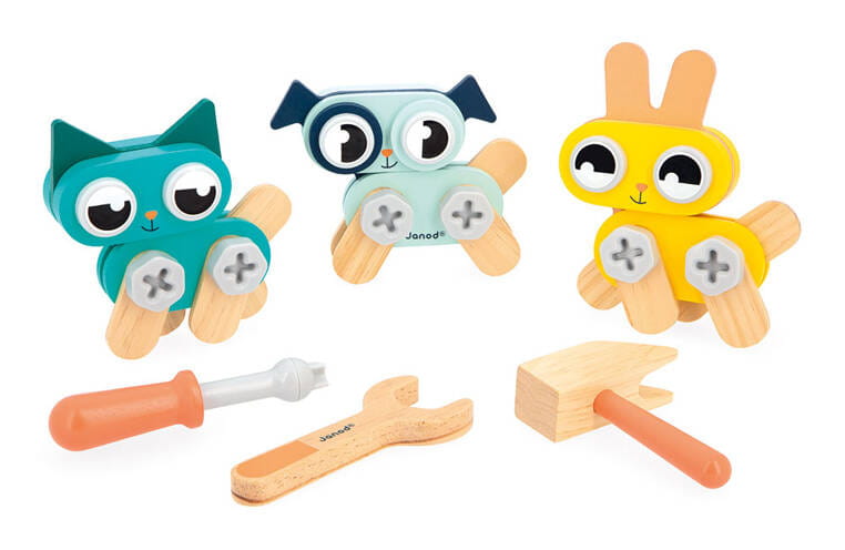 Drewniane zwierzątka do samodzielnego składania z narzędziami z serii Brico'kids francuskiej marki JANOD to idealny prezent dla małego majsterkowicza. Zestaw składa się z 53 elementów – części do zbudowania trzech uroczych zwierzątek (kotka, pieska i króliczka), śrubek, nakrętek, nakładek oraz niezbędnych narzędzi – śrubokręta, klucza i młotka. Zabawka wspomaga rozwój dziecka na wielu płaszczyznach: rozwija zdolności manualne, precyzję ruchów, cierpliwość, koncentrację, stymuluje wyobraźnię i zachęca do tworzenia historii oraz odgrywania sytuacji, znanych z obserwacji dorosłych. Gotowe zwierzątka mogą stać się piękną ozdobą dziecięcego pokoju.
