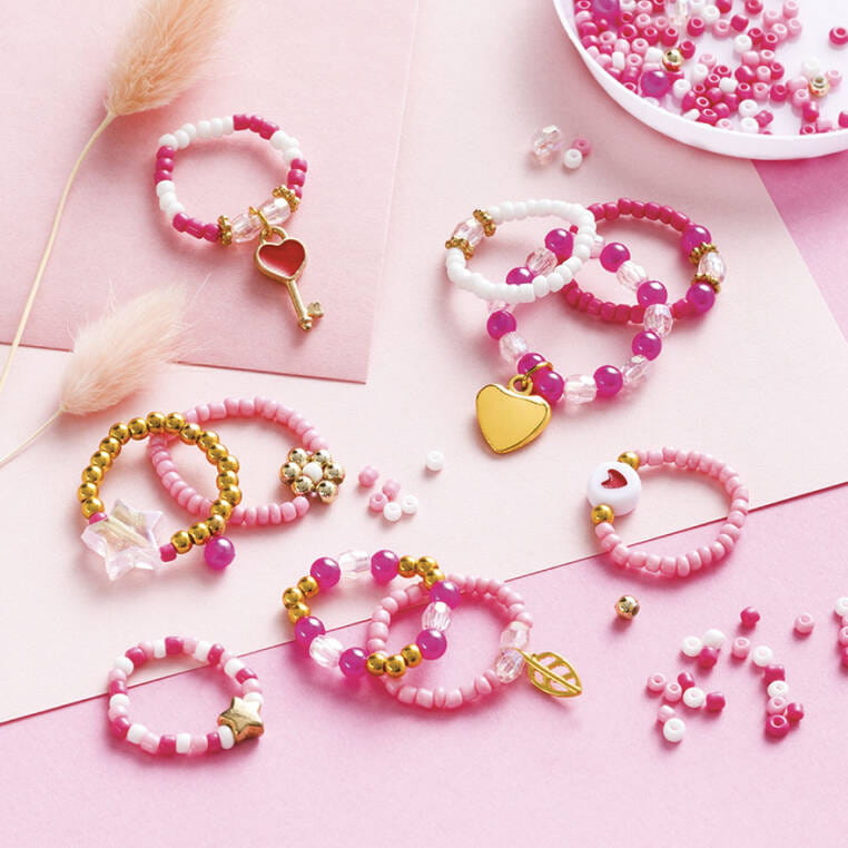Zestaw kreatywny do tworzenia biżuterii Pierścionki z koralików francuskiej marki JANOD pozwoli stworzyć w sumie aż 10 sztuk ozdób. W jego skład wchodzi 1 transparentna elastyczna żyłka, koraliki: 300 białych i różowych, 40 złotych, 15 w kolorze magenta i 16 jasnoróżowych przeźroczystych, a także 2 koralki-gwiazdki i 1 okrągły z serduszkiem, 3 złote zawieszki – serce, klucz i liść oraz podstawka, ułatwiająca pracę z tak drobnymi elementami. W kilka chwil Twoje dziecko może stać się kreatywnym jubilerem! Projektowanie i tworzenie biżuterii to godziny angażującej i jednocześnie uspokajającej, wyciszającej zabawy, a po skończonej pracy powstałe dzieła mogą jeszcze długo służyć jako ozdoby lub podarunki dla bliskich. Do zestawu dołączona jest szczegółowa instrukcja jak wykonać poszczególne ozdoby. Zestaw zaprojektowano we Francji we współpracy z francuską grupą mediową i wydawniczą Hachette. Zapakowany jest w stylowe kartonowe pudełko. Idealnie nadaje się na prezent.