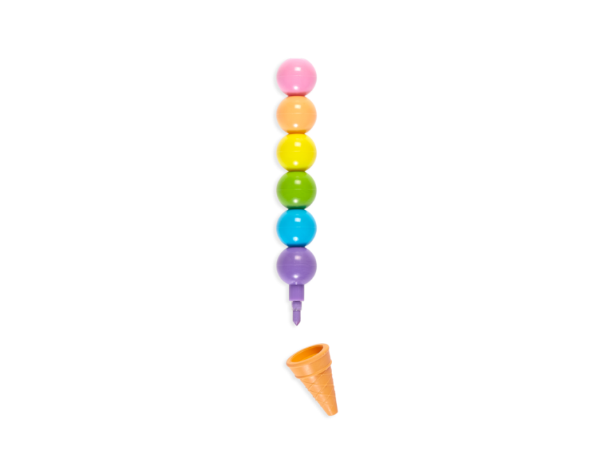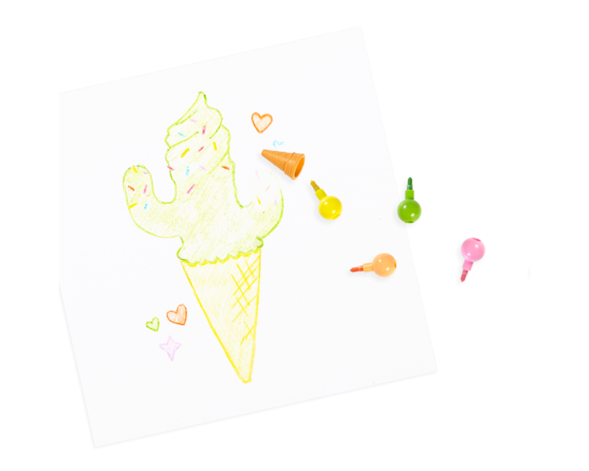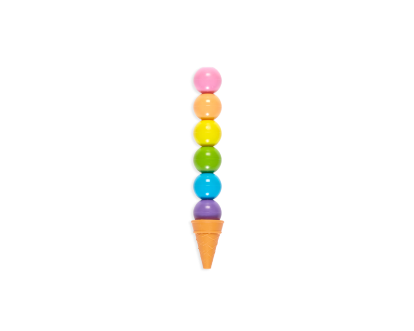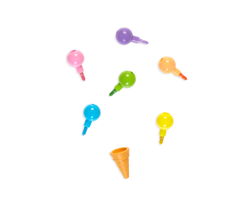 Przekładane kredki w kształcie kulkowych lodów w wafelku, można układać jedną w drugą — w szeregu. Każda z 6 gałek lodów to jeden kolor kredki, którą da się łatwo wymazać za pomocą gumki. Kolory kredek można dowolnie miksować i zmieniać ich kolejność. Stożek — wafelek to gumka do ścierania o zapachu wanilii! Ułóż kolorowe kuleczki po swojemu!