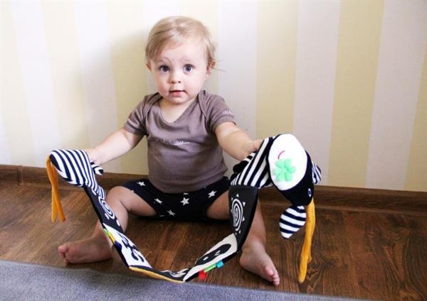 Mięciutka, materiałowo-harmonijkowa książeczka kontrastowa Króweczka Mom'care została stworzona z myślą o najmłodszych. To właśnie w pierwszym okresie życia dziecka kluczową rolę odgrywa stymulacja zmysłów. Wodzenie spojrzeniem i wpatrywanie się w zabawki rozwija zmysł wzroku oraz spostrzegawczość malucha. Do uszycia książeczek sensorycznych używane są bezpieczne, przyjemne w dotyku materiały, o różnej strukturze. Dzięki temu dziecko poznaje świat i stymuluje zmysł dotyku. Przewaga biało-czarnych, szeleszczących ilustracji trenuje spostrzegawczość i koordynację ruchową oko-ręka. Wraz z upływem czasu dziecko widzi coraz lepiej, więc można sięgać po zabawki w innych kontrastujących barwach.
