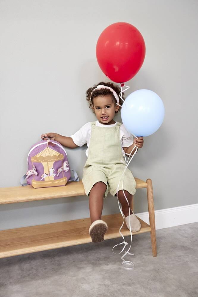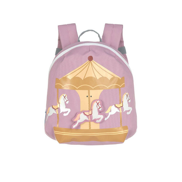 Uroczy plecaczek z Karuzelą wiedeńską niemieckiej marki LASSIG. Funkcjonalny, lekki i wygodny, idealny dla maluchów już od 2. roku życia, do przedszkola i na krótkie wycieczki. Ma lawendowy kolor i aplikację karuzeli w stylu retro z trzema konikami na froncie. Niektóre elementy pojazdu są 3D – wypukłe (jeden z koni), co przyciąga uwagę i zawsze podoba się dzieciom. Komora główna zapinana jest na suwak, posiada wewnętrzną kieszeń na butelkę z napojem oraz etykietkę z wizytówką, na której można zapisać imię dziecka i numer kontaktowy rodzica. Plecak uszyto z wysokiej jakości, trwałych materiałów, tylna ścianka jest lekko wzmocniona, ale nadal miękka w kontakcie z plecami dziecka. W górnej części znajduje się uszko do zawieszenia plecaka, np. na haczyku w szatni. Dość szerokie, grubsze i miękkie ramiączka zapewniają wygodę noszenia. Z przodu, na klatce piersiowej dodatkowo wyposażone są w stabilizujące i odciążające plecy zapięcie na zatrzask – jego wysokość, podobnie jak długość ramiączek, można regulować i na bieżąco dopasowywać do wzrostu dziecka. Uszko, paski oraz ułatwiające dziecku samodzielne zapinanie sznureczki przy suwaku mają kolor bladoniebieski, suwak, zatrzaski i elementy regulacji są białe. Materiał plecaka łatwo się czyści i jest odporny na wilgoć.