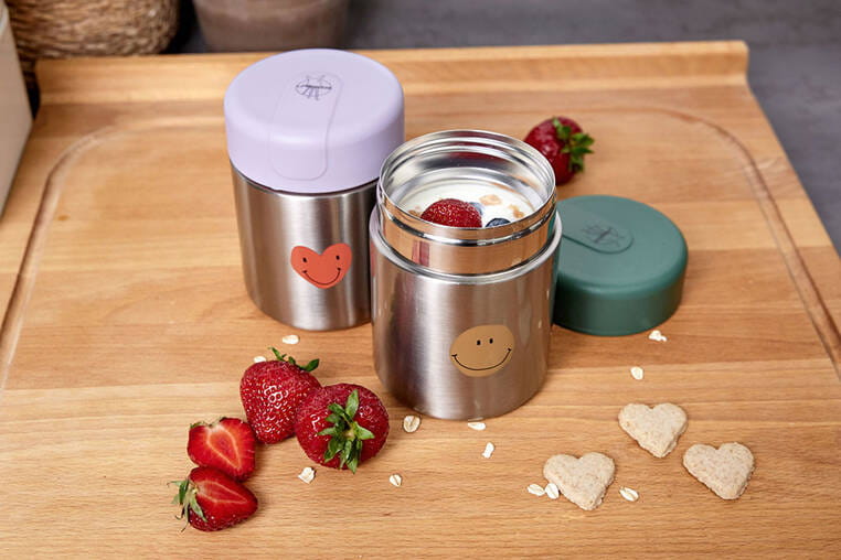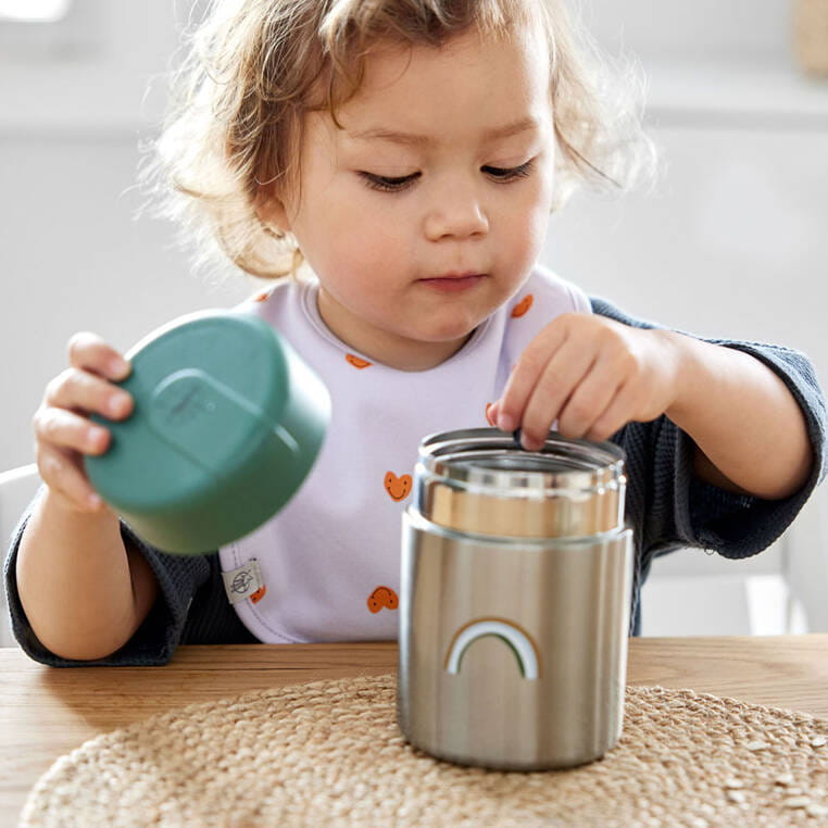 Pojemnik-termos obiadowy niemieckiej marki LASSIG przyda się nie tylko podczas podróży, ale także spacerów czy wycieczek. Termos ma pojemność 315 ml, jest lekki, poręczny i wytrzymały – dzięki podwójnym ściankom ze stali nierdzewnej długo zachowuje temperaturę posiłków, zarówno gorących, jak i zimnych. Szeroki otwór ułatwia napełnianie, podawanie jedzenia i czyszczenie. Hermetyczna ciemnozielona pokrywka dobrze przylega do pojemnika, posiada także dodatkową silikonową uszczelkę, zapewniającą szczelność naczynia. Pojemnik jest łatwy w obsłudze i ma ergonomiczny kształt – z łatwością zmieści się do plecaka, torebki czy bocznej kieszonki. Ma srebrny kolor z grafikami: karmelową uśmiechniętą buźką po jednej stronie i tęczą po drugiej. Stanowi część większej kolekcji Happy Rascals. Możesz dobrać do niego inny produkt w tej samej gamie kolorystycznej lub z tym samym motywem.