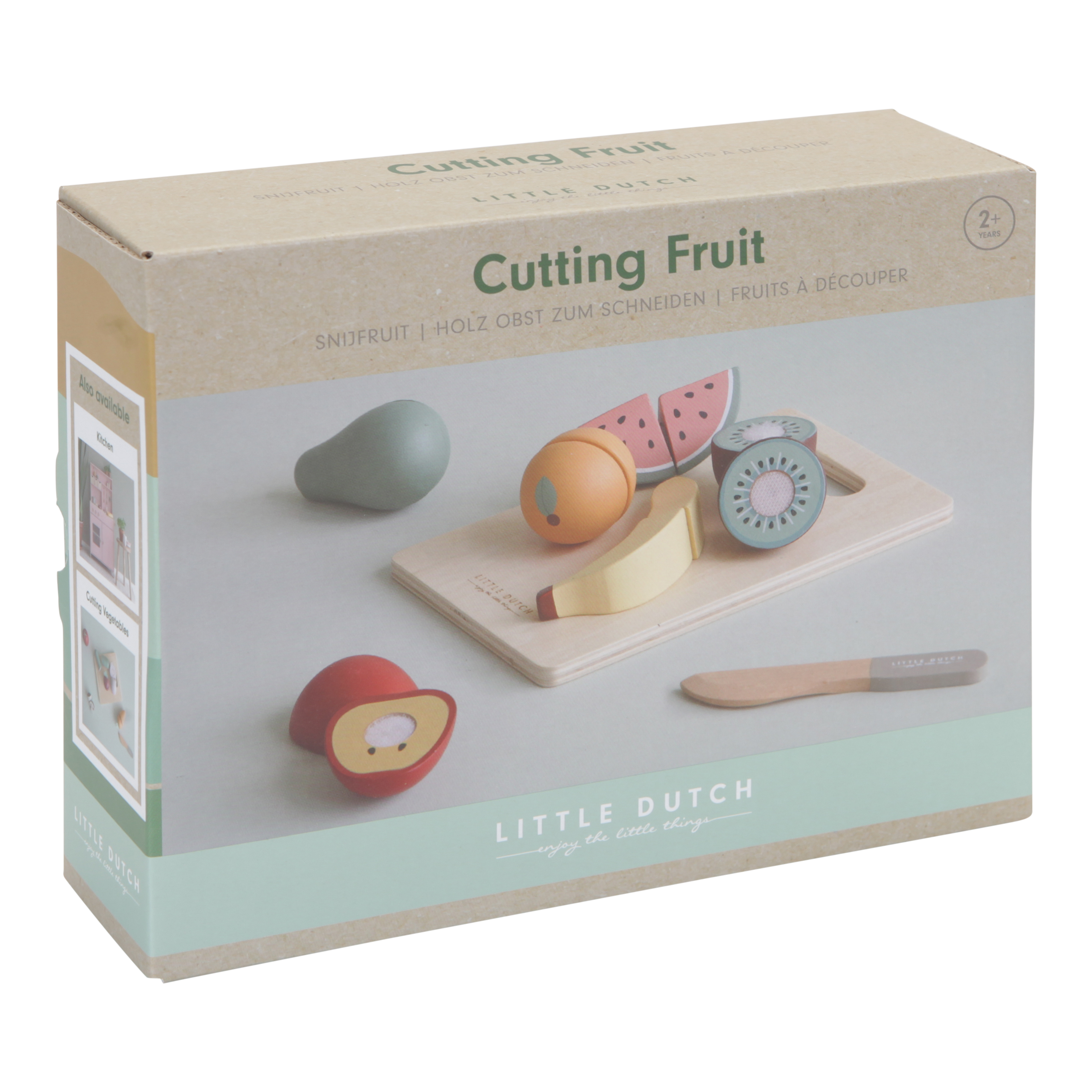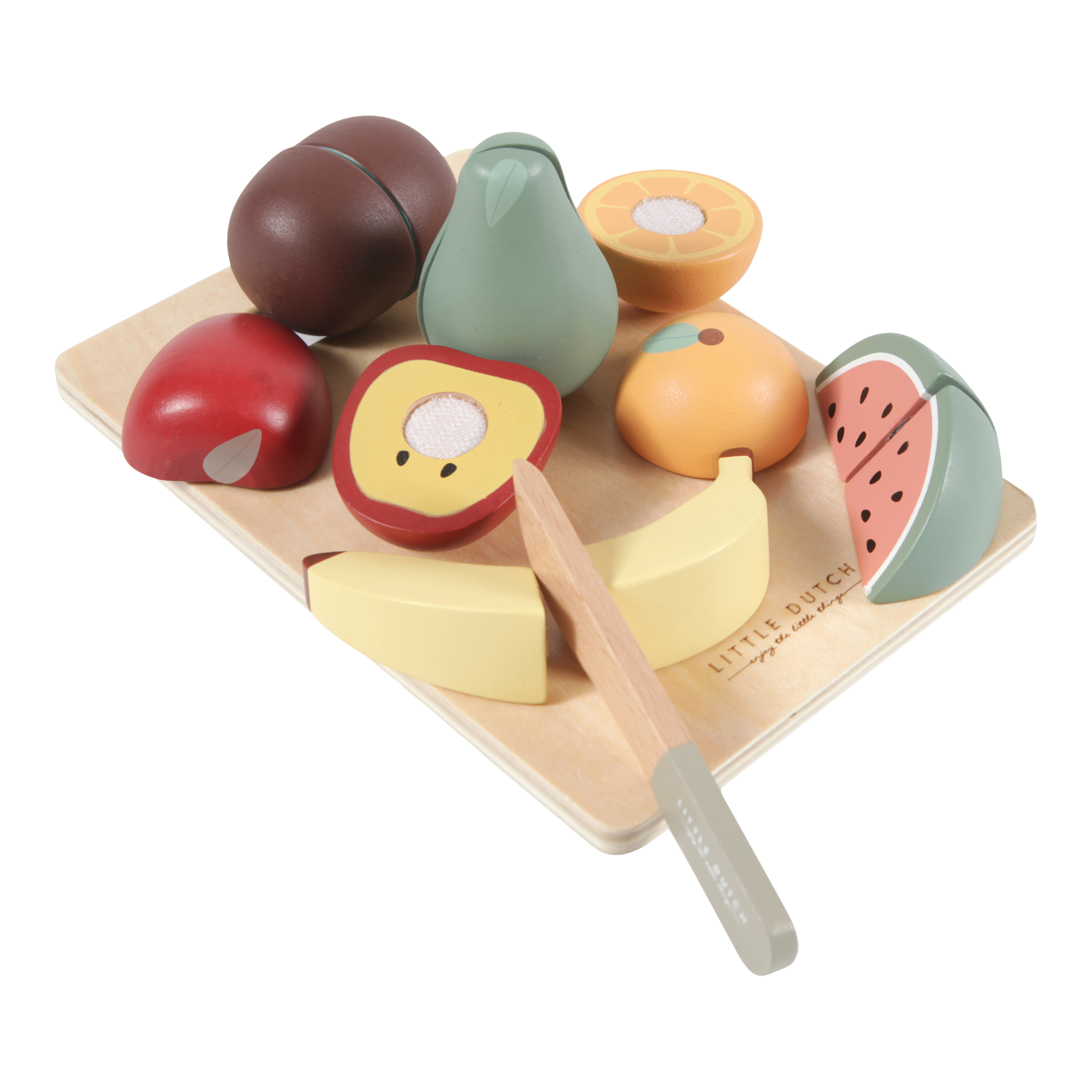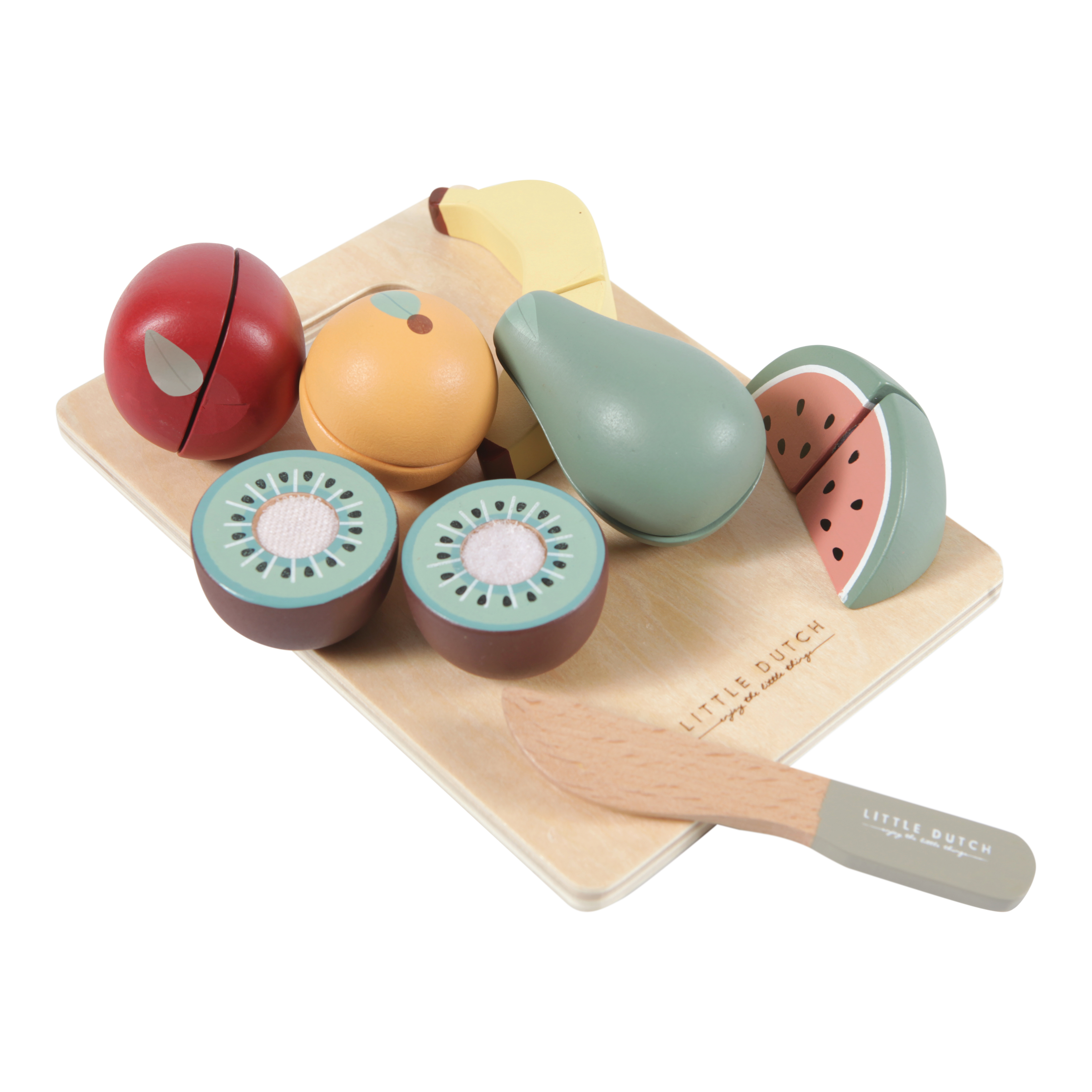 Zestaw składający się z owoców, takich jak: jabłuszko, banan, kiwi, gruszka, pomarańczka, arbuz oraz deseczka wraz z bezpiecznym, drewnianym nożykiem. Wszystko można przeciąć na pół i łatwo skleić ponownie za pomocą rzepów. Owoce idealnie sprawdzą się do nauki oraz wpajania maluchom zasad zdrowego odżywiania już od najmłodszych lat. Doskonałe uzupełnienie do naszej kuchennej serii, w skład której wchodzą kuchnia, ekspres do kawy i toster. Dostępny również zestaw z warzywami. Świetna zabawa gwarantowana!