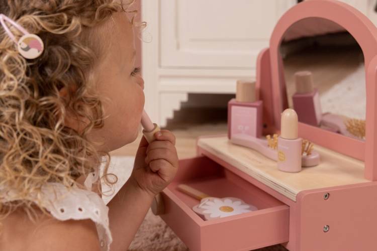 Drewniana toaletka od Little Dutch. Piękna różowa drewniana toaletka dla dzieci, zachęca do pomysłowej i niekończącej się zabawy. W toaletce znajduje się obrotowe lustro oraz 6 drewnianych kosmetyków, takich jak szczotka do włosów, szminka, flakonik perfum, cień do powiek, pilnik do paznokci i lakier do paznokci. Toaletka posiada również szufladę, do przechowywania skarbów. Każda dziewczynka będzie zachwycona! Pięknie wykonana z wysokiej jakości drewna FSC. Doskonały pomysł na prezent.