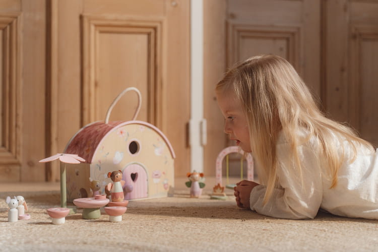 Leśny domek Fairy Garden FSC od Little Dutch. Ten uroczy domek z bajkowego ogrodu, w którym wróżki z delikatnymi skrzydełkami bawią się i tańczą, może być miejscem czarujących przygód. Z udziałem drewnianych figurek Twoje dziecko może tworzyć własne historie i opowieści - spotkania w domu czy ogrodzie, rozmowy przy stoliku lub ognisku. A może zabawa na huśtawce? Domek składa się z dwóch pięter. Dzięki drewnianemu zamknięciu łatwo się go otwiera i zamyka, a uchwyt na dachu umożliwia łatwe przenoszenie. Kompaktowe rozmiary sprawią, że sprawdzi się w każdym pokoju dziecięcym. Do zestawu dołączone są figurki wróżek i zwierząt, a także wyposażenia domu i ogrodu. Stanowi świetny pomysł na prezent i doskonałe uzupełnienie dla pozostałych zabawek z kolekcji Fairy Garden od Little Dutch.