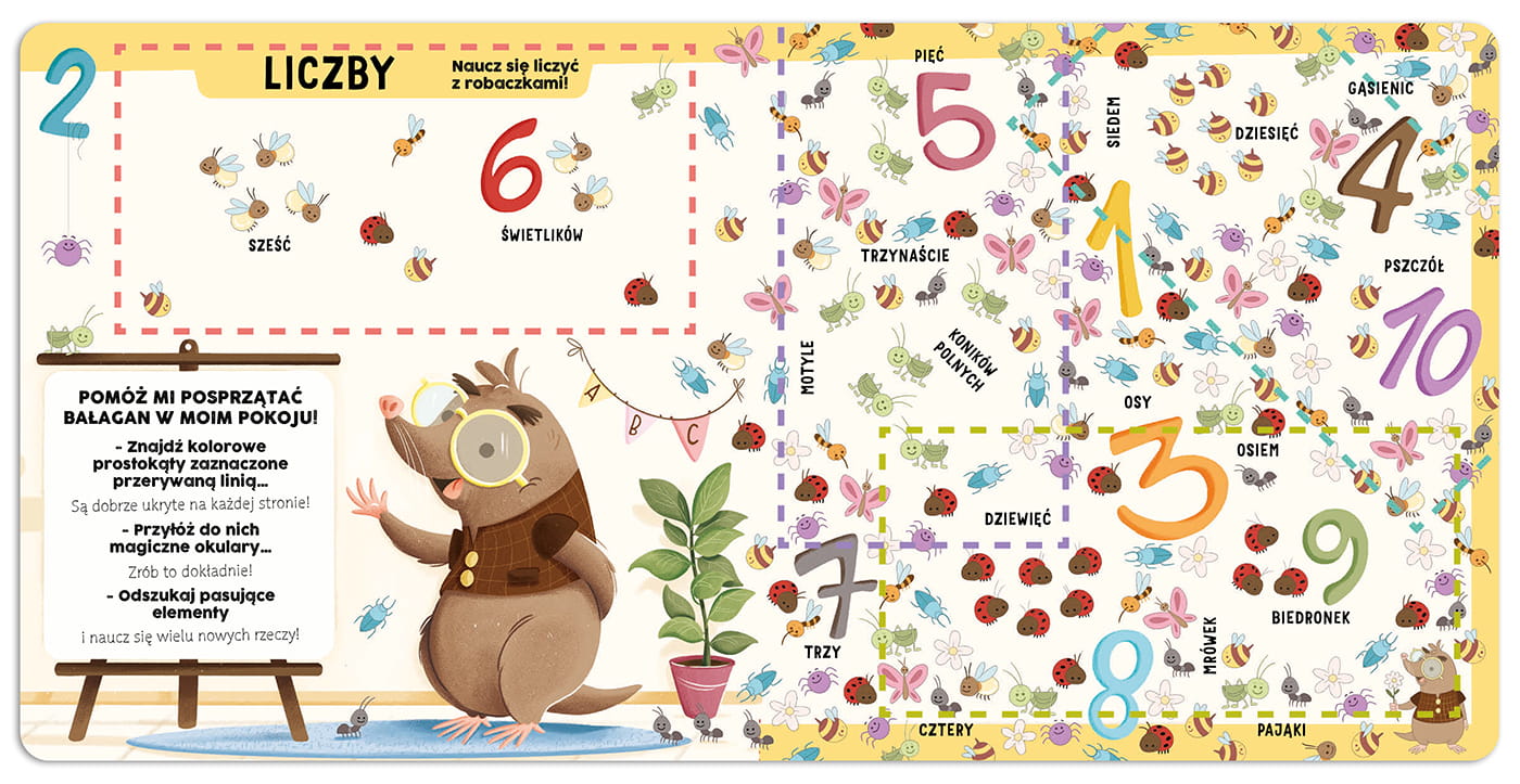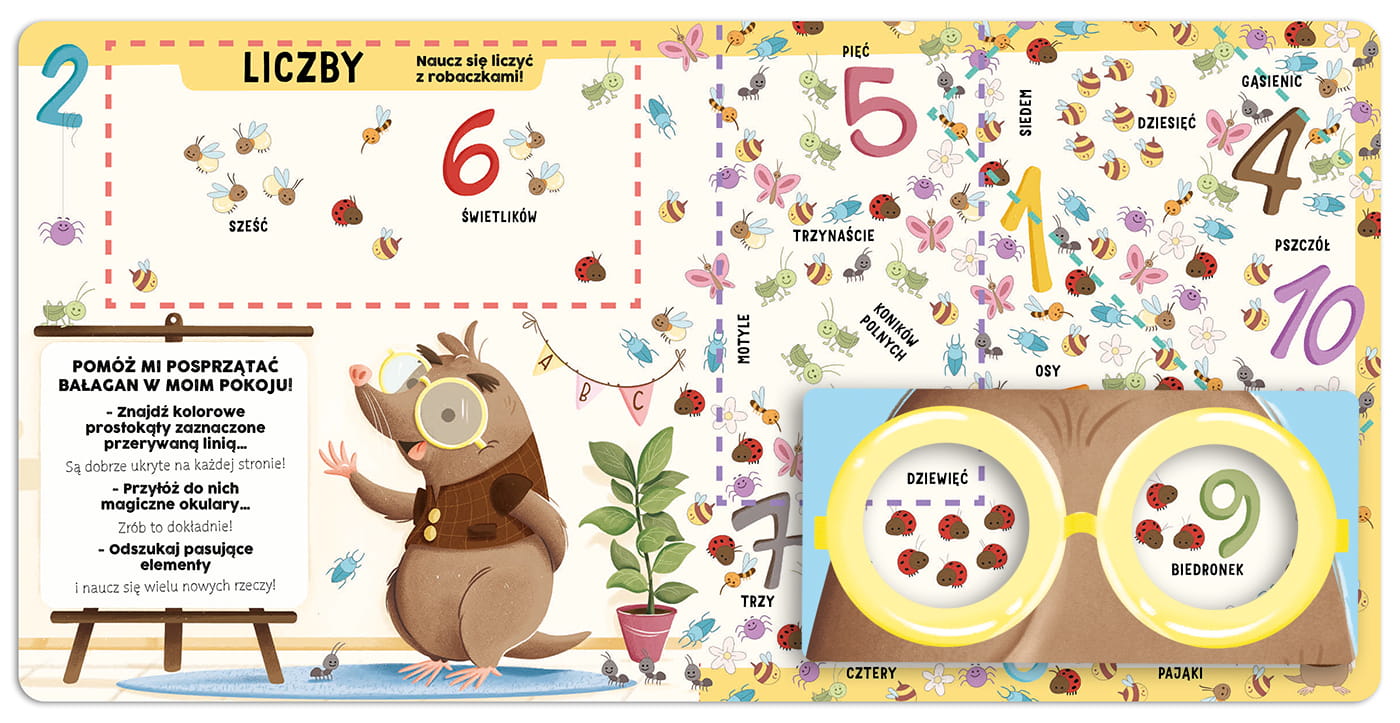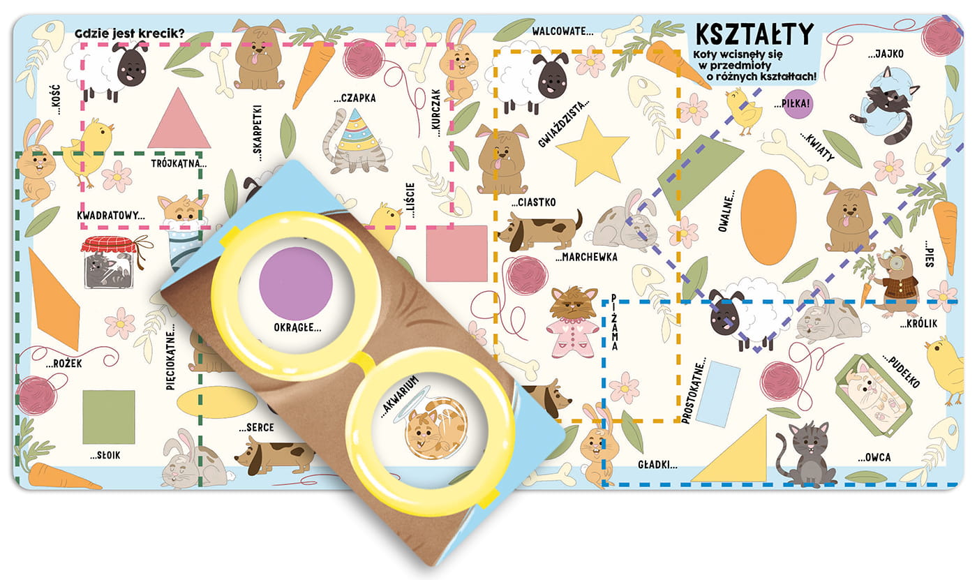 Na kolejnych stronach mały czytelnik będzie przykładał magiczne okulary, żeby wyszukiwać i porządkować: liczby, kolory, emocje, kształty i przeciwieństwa. Dzięki temu utrwali swoją wiedzę, a przy okazji rozwinie spostrzegawczość i koordynację.