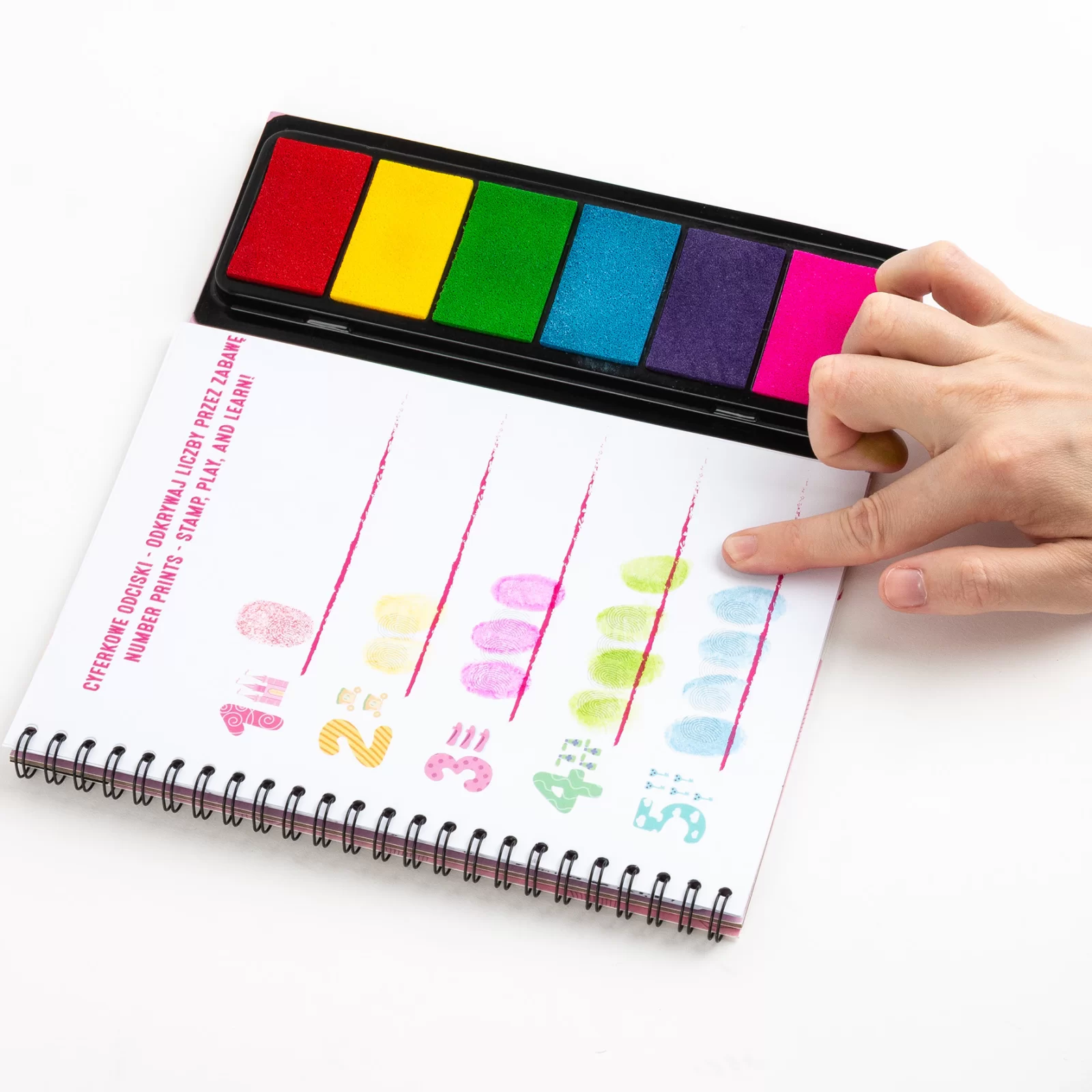 Książeczka z magicznymi wróżkami, słodkimi stworkami i krasnoludkami do malowania paluszkami. Wybierz wzór z książki, który chcesz wypełnić – możesz skorzystać ze stron edukacyjnych, ucząc się liczyć, stworzyć bardzo łatwo zwierzaka przy pomocy odcisków palców albo pokolorować jeden z obrazków znajdujących się w środku. Dotknij gąbeczki z wybranym kolorem kilkukrotnie, możesz także przyłożyć palec do kilku gąbeczek, aby zmieszać ze sobą barwy i utworzyć nowe kolory. Przyciśnij paluszki w odpowiednich miejscach na arkuszu. Baw się, eksperymentując z kolorami i różnymi odciskami. A może chcesz zabawić się w detektywa? Ta wyjątkowa książeczka zawiera gąbeczki z kolorowymi tuszami, 21 kolorowanek oraz 8 kart edukacyjnych.