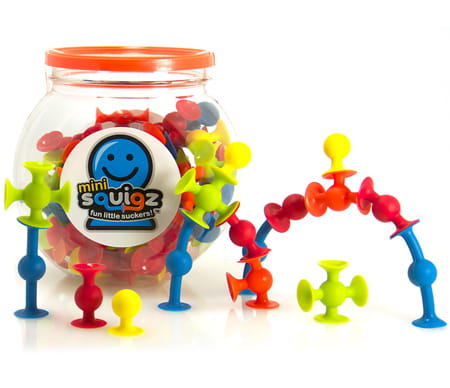 Silikonowe klocki Mini Przyssawki Squigz to mini klocki, ale pełnowartościowy członek rodziny Przyssawek Squigz, są 40% mniejsze i o tyle słodsze, mają nowe kształty, nowe kolory, nowe opakowanie i jest ich więcej, bo aż 75!