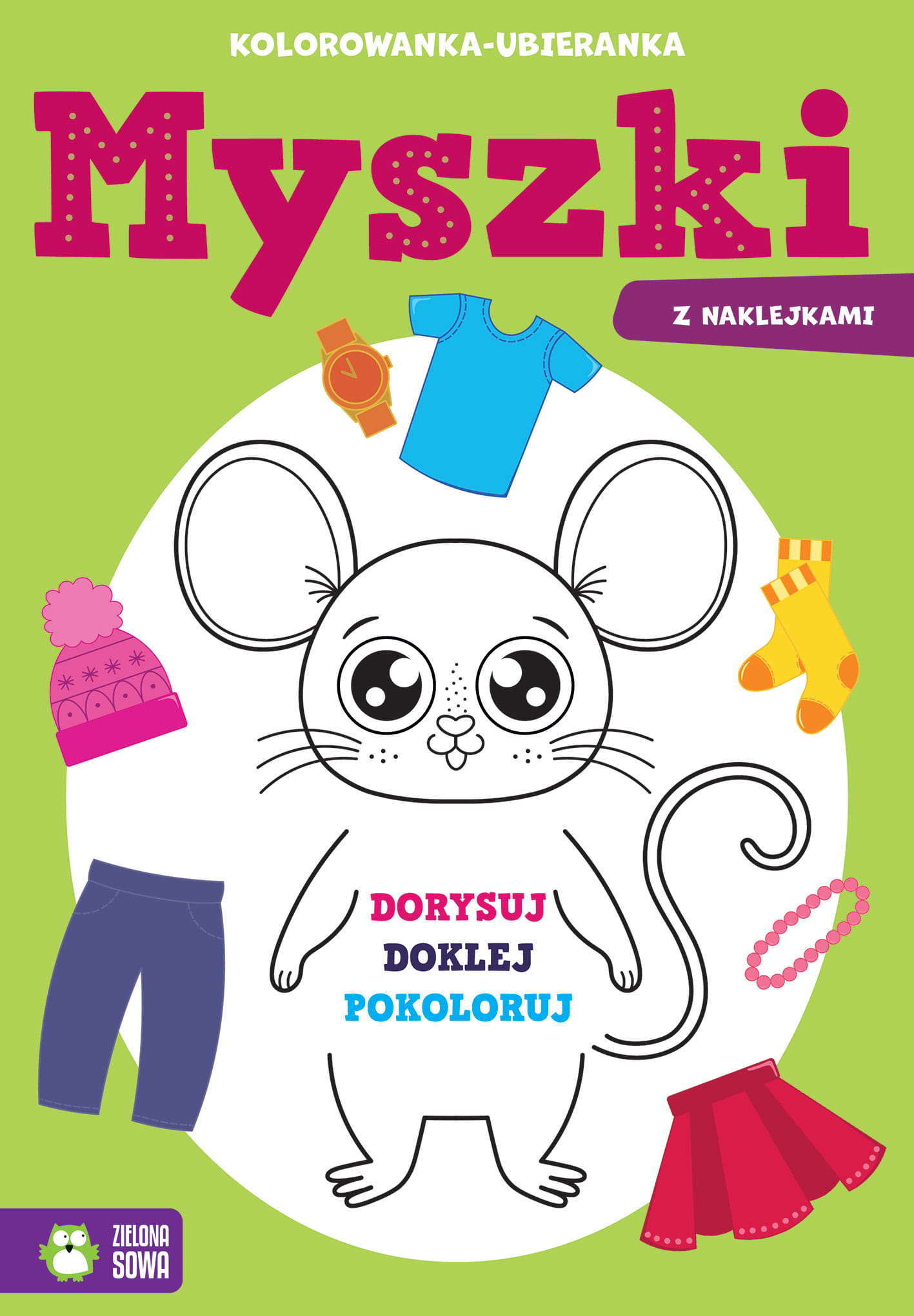 Wesołe kolorowanki z dodatkową aktywnością. Najpierw dziecko ma za zadanie dorysować zwierzątku ubranie, a następnie pokolorować ilustrację i ozdobić ją naklejkami.