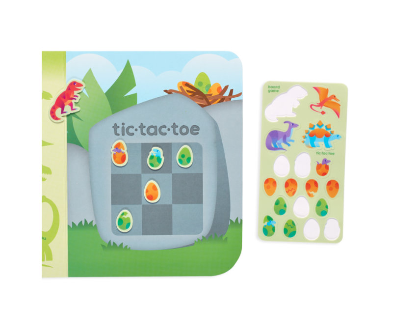 - Zestaw zawiera: dwa arkusze z naklejkami, sześciostronicową książeczkę do zabawy, w tym planszę do gry z kołem obrotowym, planszę „dopasuj i ucz się” oraz „kółko i krzyżyk”.