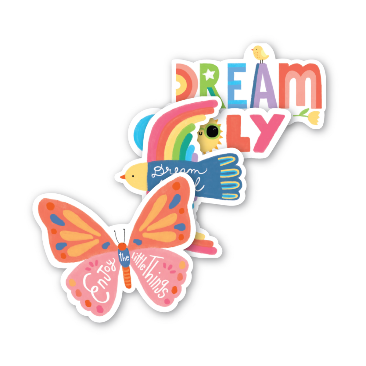 Te wodoodporne naklejki winylowe to piękny sposób, aby przypomnieć dziecku (lub sobie!), że wciąż warto umieć bujać w obłokach i oddawać się marzeniom! W zestawie znajdują się cztery ładne naklejki, które idealnie nadają się np. na butelki z wodą, etui na instrumenty, laptopy, czy notesy.