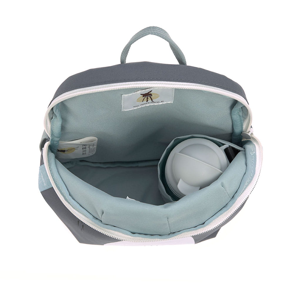 Plecak uszyto z wysokiej jakości, trwałych materiałów, tylna ścianka jest lekko wzmocniona, ale nadal miękka w kontakcie z plecami dziecka. W górnej części znajduje się uszko do zawieszenia plecaka, np. na haczyku w szatni. Dość szerokie, grubsze i miękkie ramiączka zapewniają wygodę noszenia. Z przodu, na klatce piersiowej dodatkowo wyposażone są z w stabilizujące i odciążające plecy zapięcie na zatrzask – jego wysokość, podobnie jak długość ramiączek, można regulować i na bieżąco dopasowywać do wzrostu dziecka. Uszko, paski oraz ułatwiające dziecku samodzielne zapinanie sznureczki przy suwakach mają kolor bladoniebieski. Materiał plecaka łatwo się czyści i jest odporny na wilgoć.