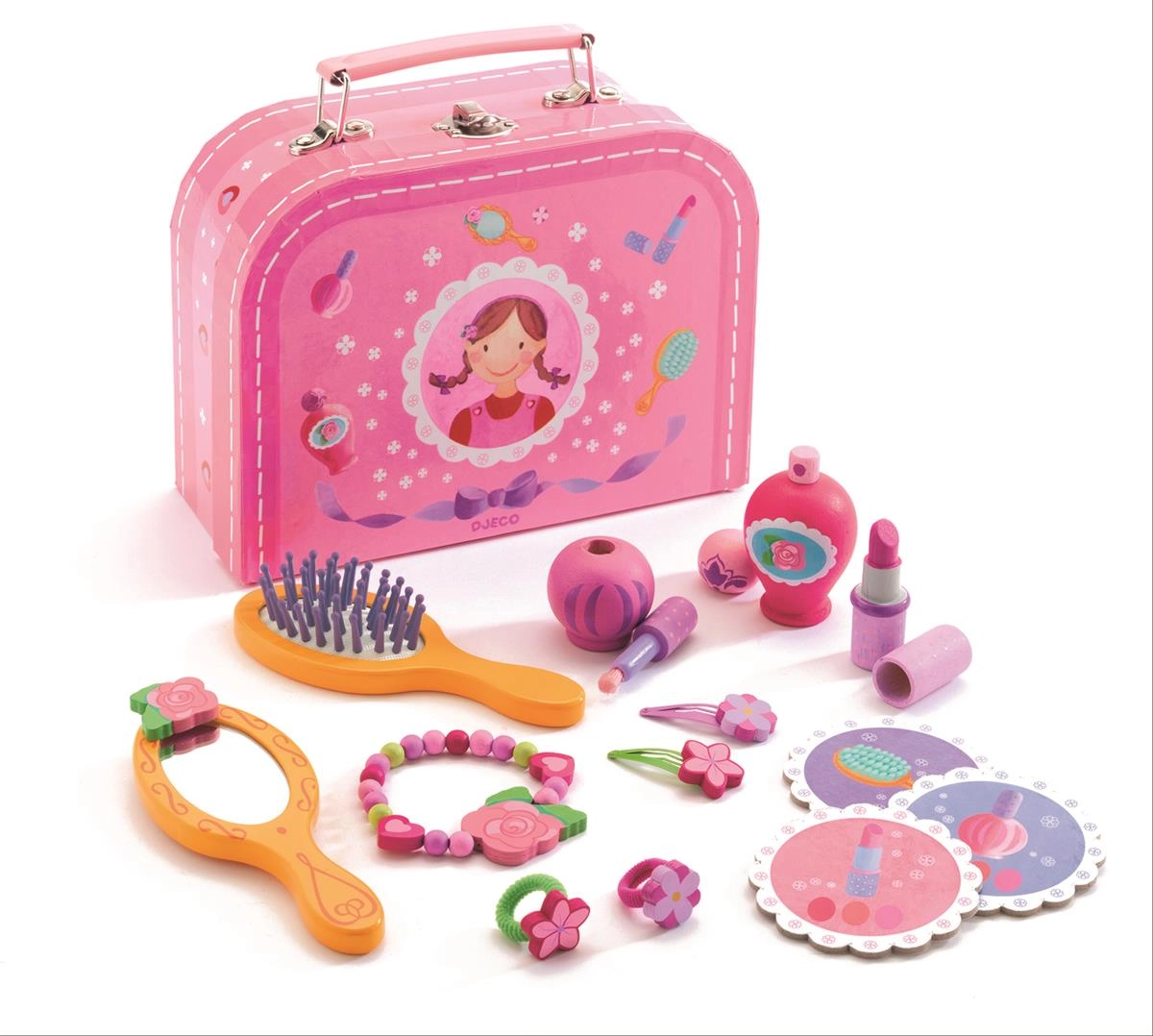 Śliczna walizeczka z grubego kartonu z akcesoriami dla małej damy: lusterko, szczotka do włosów, biżuteria, perfumy, szminka, serwetki, spinki. Wszystkie elementy wykonane z lekkiego miału drewnianego.