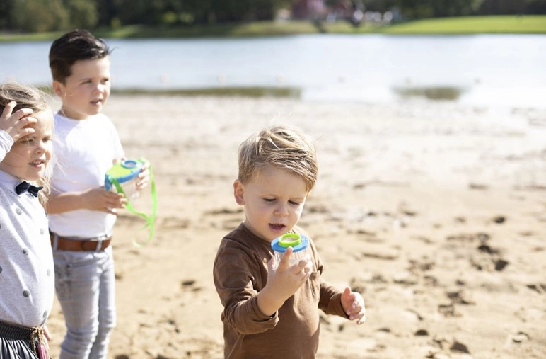 Kubeczek został zaprojektowany z myślą o wygodzie i łatwości użytkowania przez dzieci: jego przezroczysta konstrukcja pozwala obserwować otoczenie z różnych kątów, a kompaktowe wymiary sprawiają, że maluch może samodzielnie go trzymać i używać podczas zabawy – w ogrodzie, na spacerze czy szkolnej wycieczce.