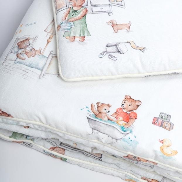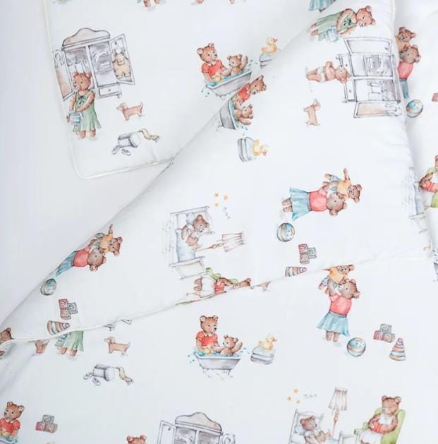 Zestaw zawiera kołderkę i płaską, bezpieczną dla niemowląt poduszkę.