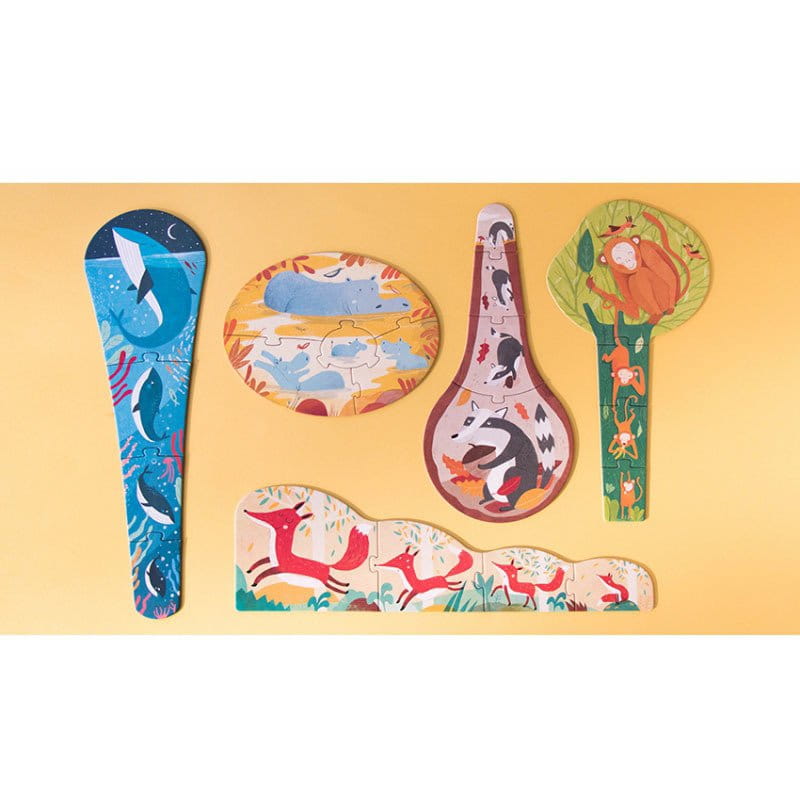 20 elementów puzzli wykonanych jest z wytrzymałego, utwardzonego kartonu.