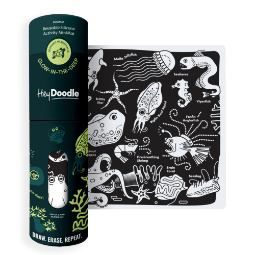 Jak wszystkie maty HeyDoodle, świecąca w ciemności mata jest ekologiczna, nietoksyczna i zaprojektowana do wielokrotnego użytku. Mata wykonana jest w całości z najwyższej jakości silikonu.