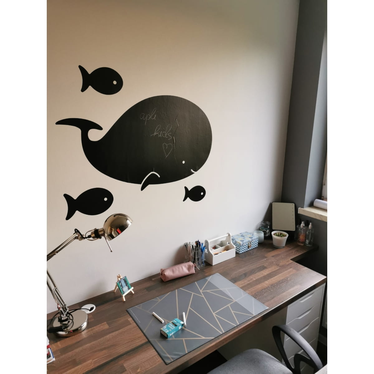 Czarna tablica kredowa w formie naklejki stanowi doskonałą alternatywę dla standardowych, dużych tablic. Można przykleić ją dosłownie wszędzie! Jest dużych rozmiarów- prawie 60 × 100 cm co pozwala maluchowi na popis kreatywności. Świetnie sprawdzi się również jako ozdoba dziecięcego pokoju. Tablica pełni funkcję dydaktyczną, ale również rozwija poznawczo i manualnie.