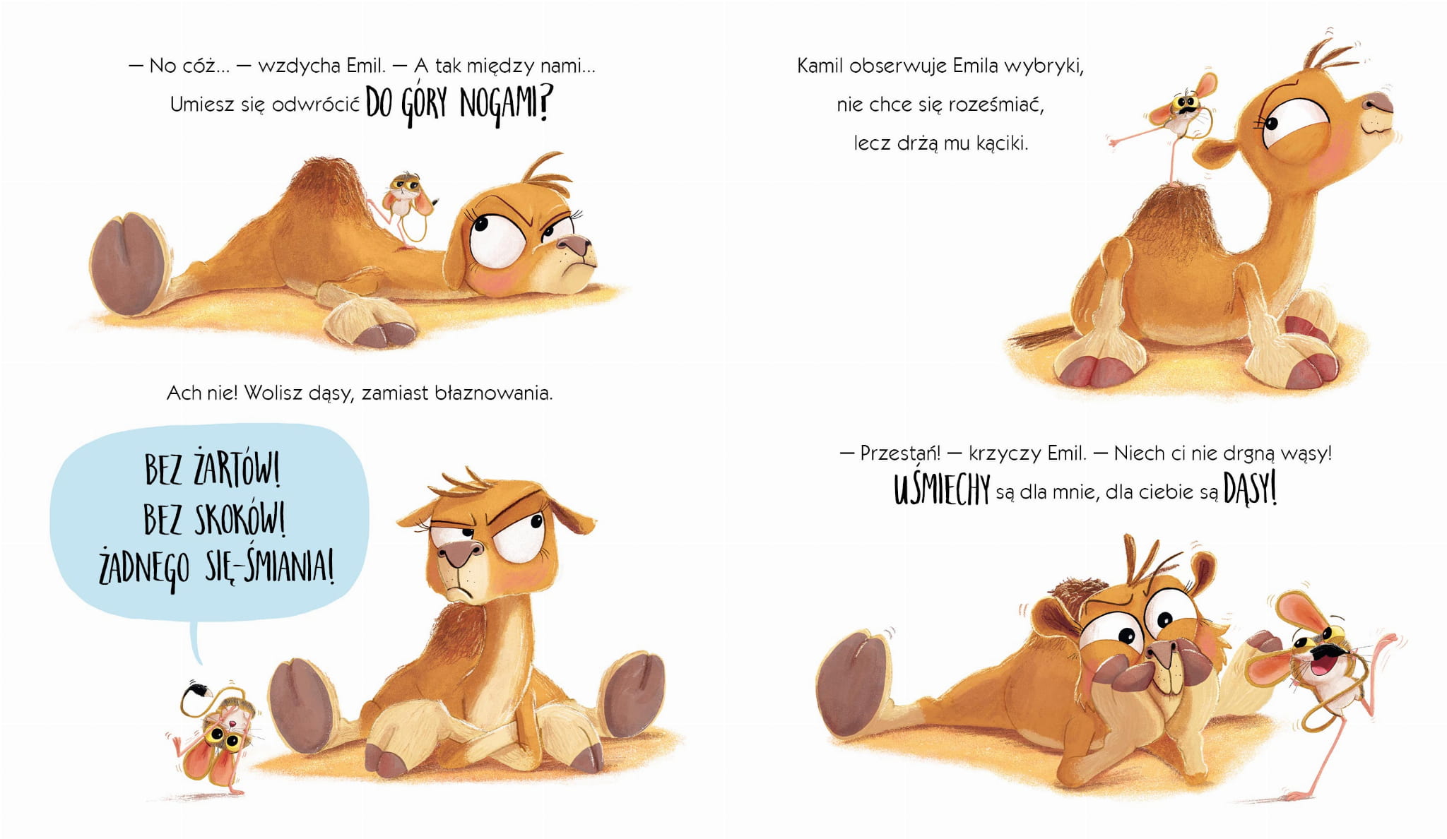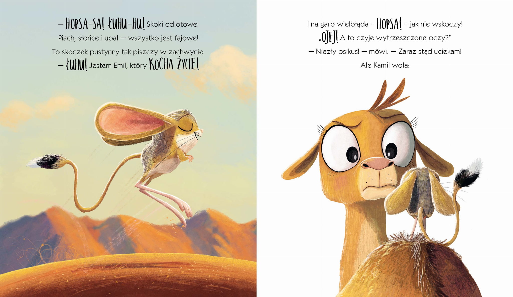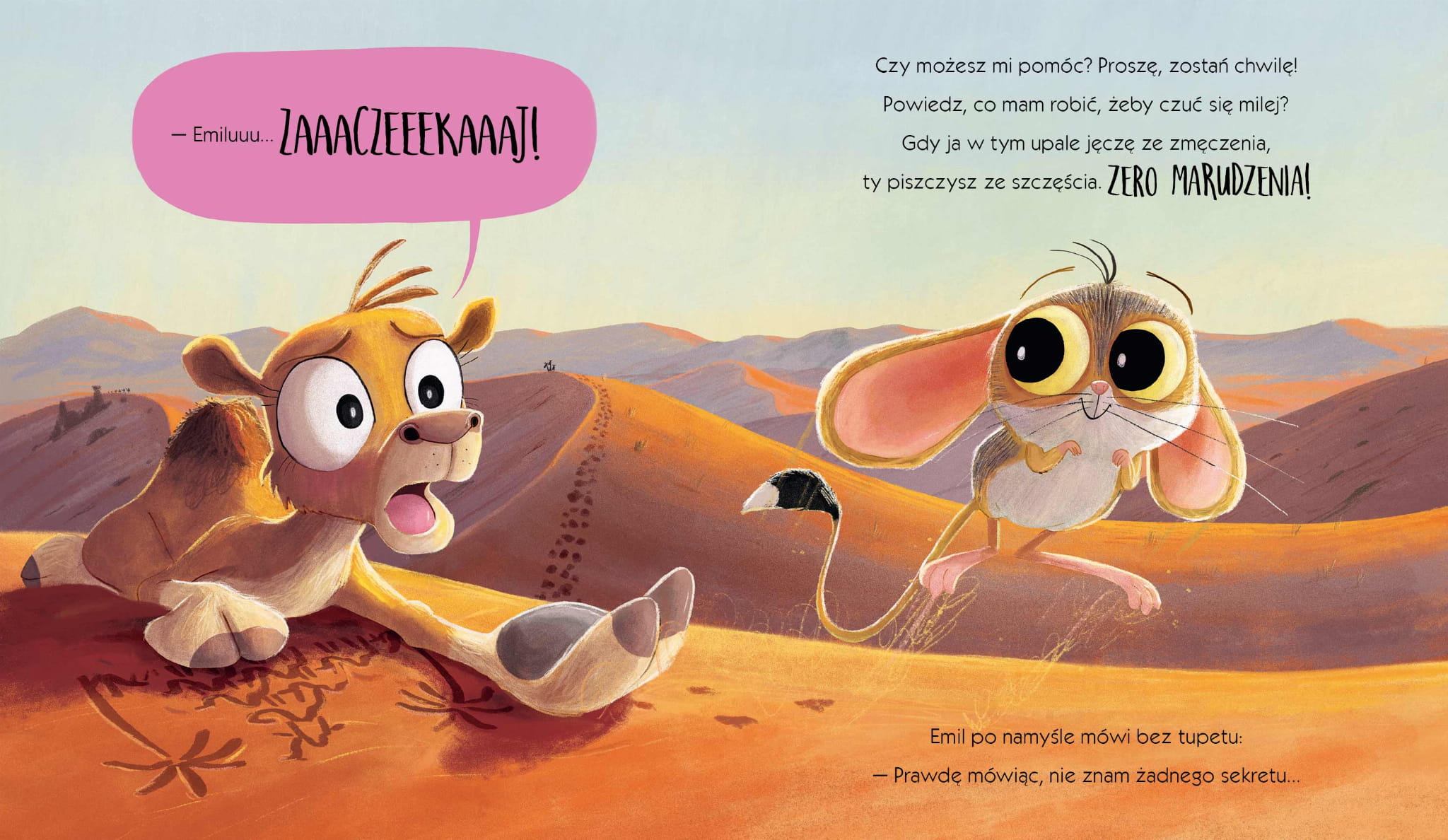 Na pustyni wstaje nowy dzień. Stado wielbłądów wyrusza na poszukiwanie oazy, by się napić i pobawić. Mały wielbłąd obudził się w złym humorze. Nie ma siły i jest mu bardzo gorąco, więc nie zamierza spacerować w upale! I nic, ABSOLUTNIE NIC, nie wprawi go w lepszy nastrój i nie zachęci do działania. A może jednak? Czy najweselsze stworzenie na pustyni będzie w stanie mu pomóc?