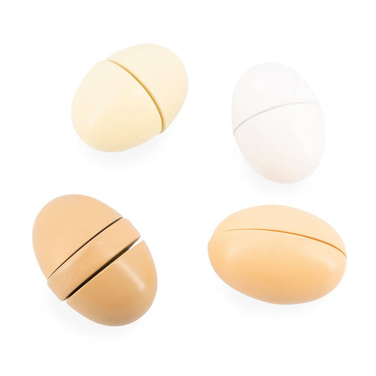 Zestaw 4 drewnianych jajek w kartonowej wytłaczance francuskiej marki JANOD sprawi mnóstwo radości każdemu dziecku. Pozwoli mu bezpiecznie uczestniczyć razem z rodzicem w codziennych kuchennych czynnościach i rozwijać pasję gotowania. W skład zestawu wchodzą białe, kremowe i beżowe jajka: 1 podzielone na pół w pionie i łączone na rzep, 1 podzielone na pół w poziomie i łączone na rzep, 1 podzielone na pół w poziomie i łączone na magnes oraz 1 podzielone na 3 części łączone na rzep. Jajka mają rzeczywiste rozmiary i stanowią świetne uzupełnienie każdej dziecięcej kuchni.