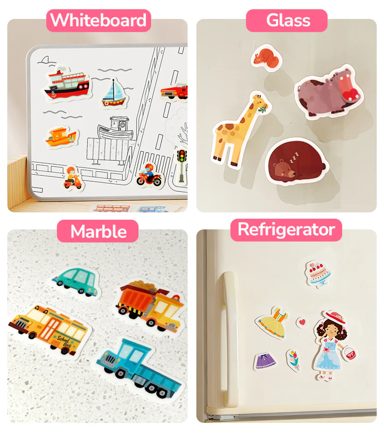 Zwierzęta, które można ustawiać, przestawiać i układać od nowa – ile razy się chce. 30 żelowych naklejek bez śladów, gotowych na kolejną podróż. Rozwija motorykę małą i koncentrację.