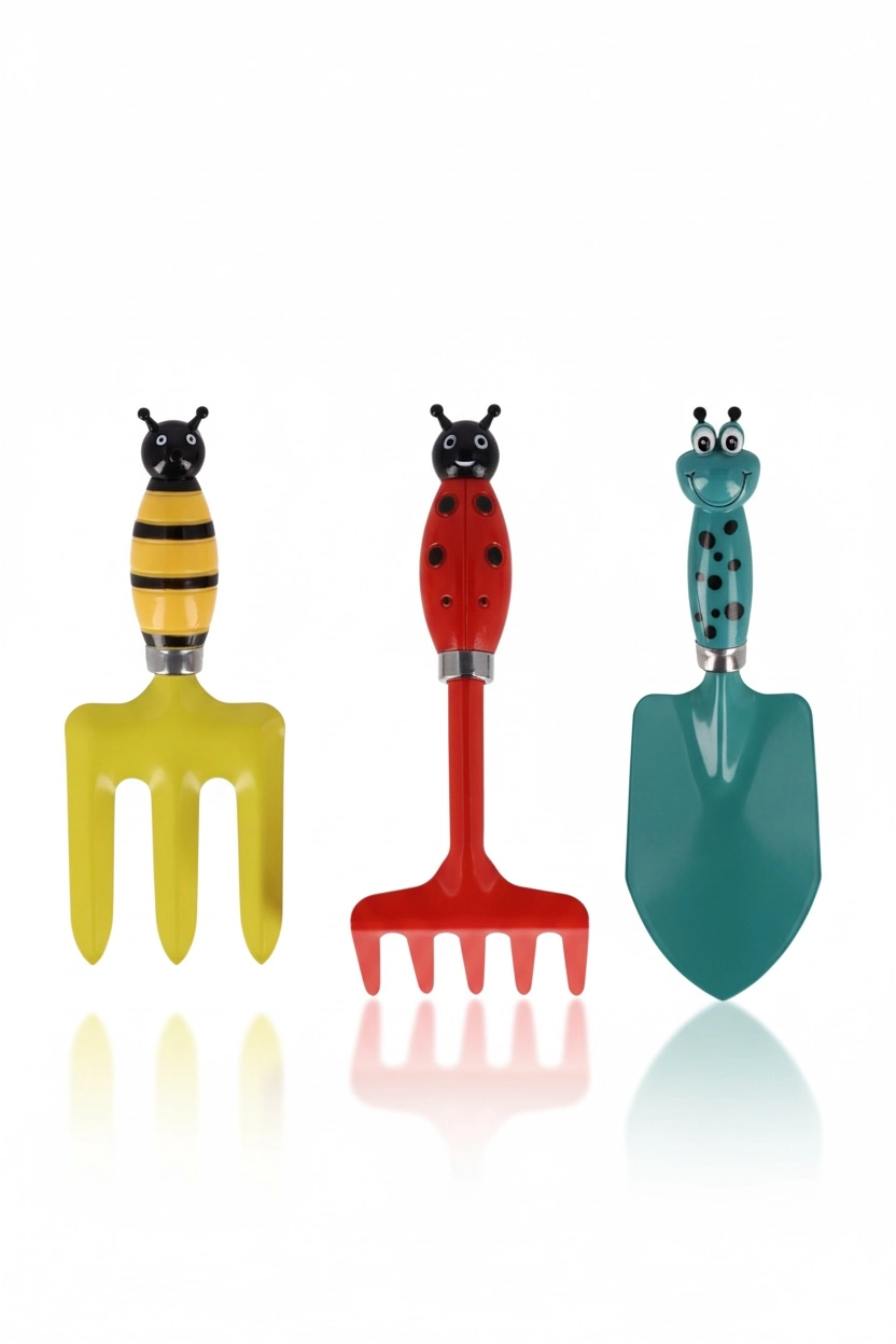 Każde narzędzie zostało ozdobione kolorowym motywem owadów, który przyciąga uwagę i zachęca do zabawy. Trzonek dopasowany jest do dziecięcych dłoni — lekki, wygodny w trzymaniu i bezpieczny w użytkowaniu, co sprawia, że młodzi ogrodnicy chętniej angażują się w prace ogrodowe, ucząc się odpowiedzialności i bliskości z naturą.