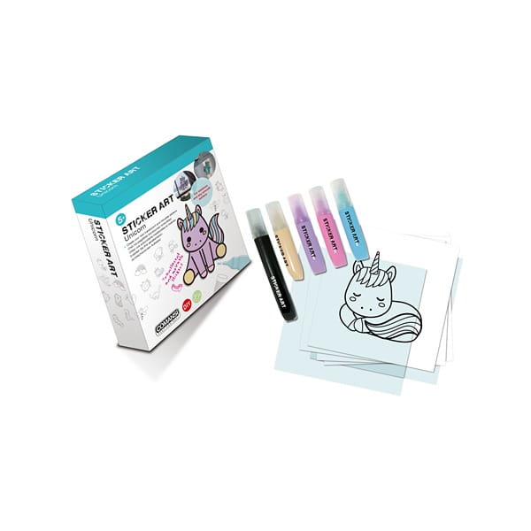 Sticker Art Jednorożce to kreatywna zabawa dla starszych dzieci (5+), które lubią wyzwania i tworzenie od podstaw. W zestawie znajdziesz szablony z rysunkami oraz folię, którą kładzie się na wzór – dziecko lub rodzic odrysowuje kontury, tworząc własne obramowanie. Po wyschnięciu można wypełnić wnętrze kolorowymi żelowymi markerami, tworząc niepowtarzalne naklejki 3D. Gotowe dzieła świetnie wyglądają na oknach, zeszytach czy lustrach, a satysfakcja z efektu jest gwarantowana!
