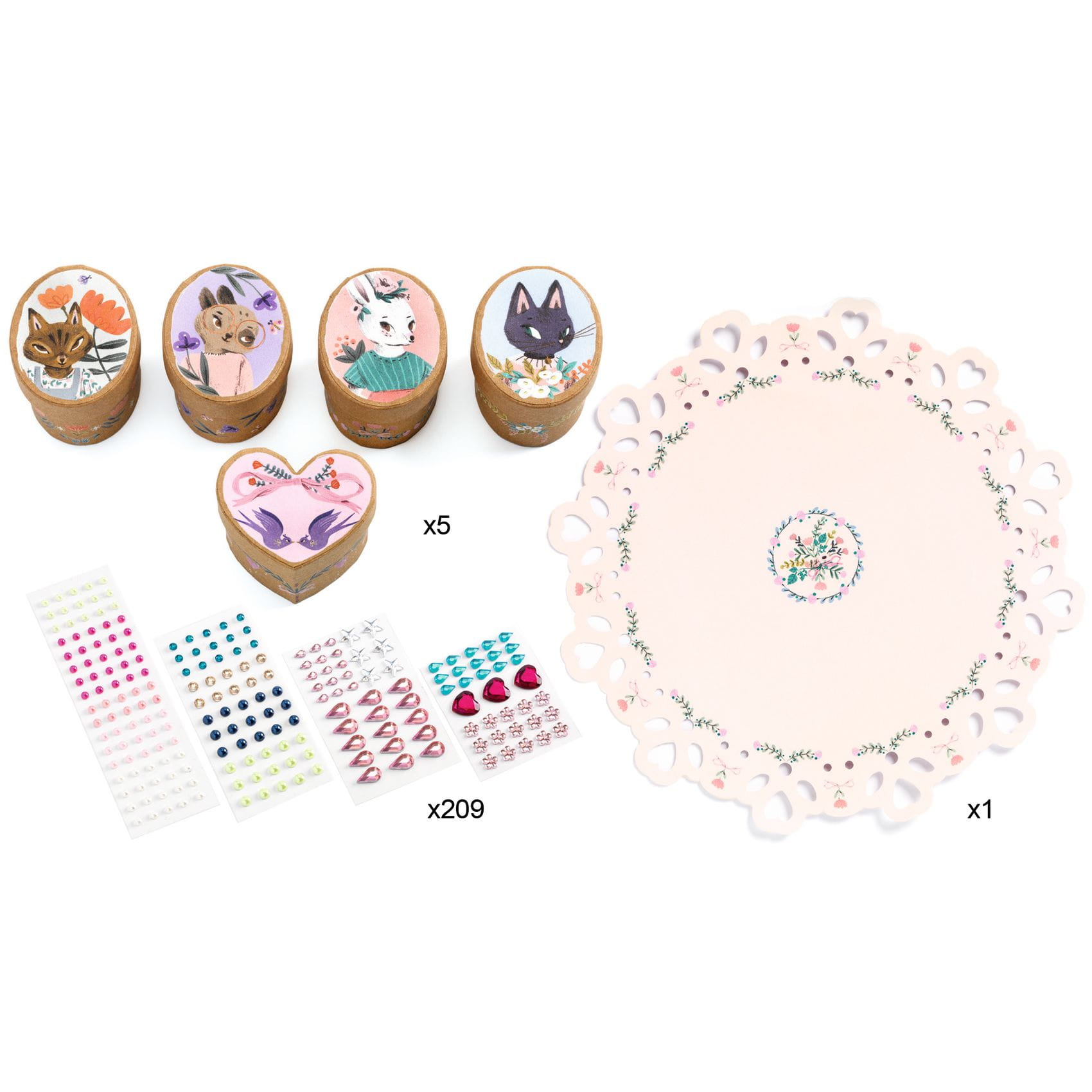 Zestaw do samodzielnego stworzenia 5 uroczych mini pudełeczek, które można ozdobić za pomocą ponad 200 samoprzylepnych kolorowych i mieniących się kamyczków. Szkatułki będą idealne do przechowywania małych skarbów oraz będą stanowić ozdobę dziecięcego pokoju. Można się sugerować wzorami przedstawionymi w dołączonej instrukcji lub dać się ponieść swojej wyobraźni i kreatywności. W zestawie znajduje się także serwetka do podłożenia pod pudełeczka. Wykonane z papieru i kartonu posiadającego certyfikat FSC®.
